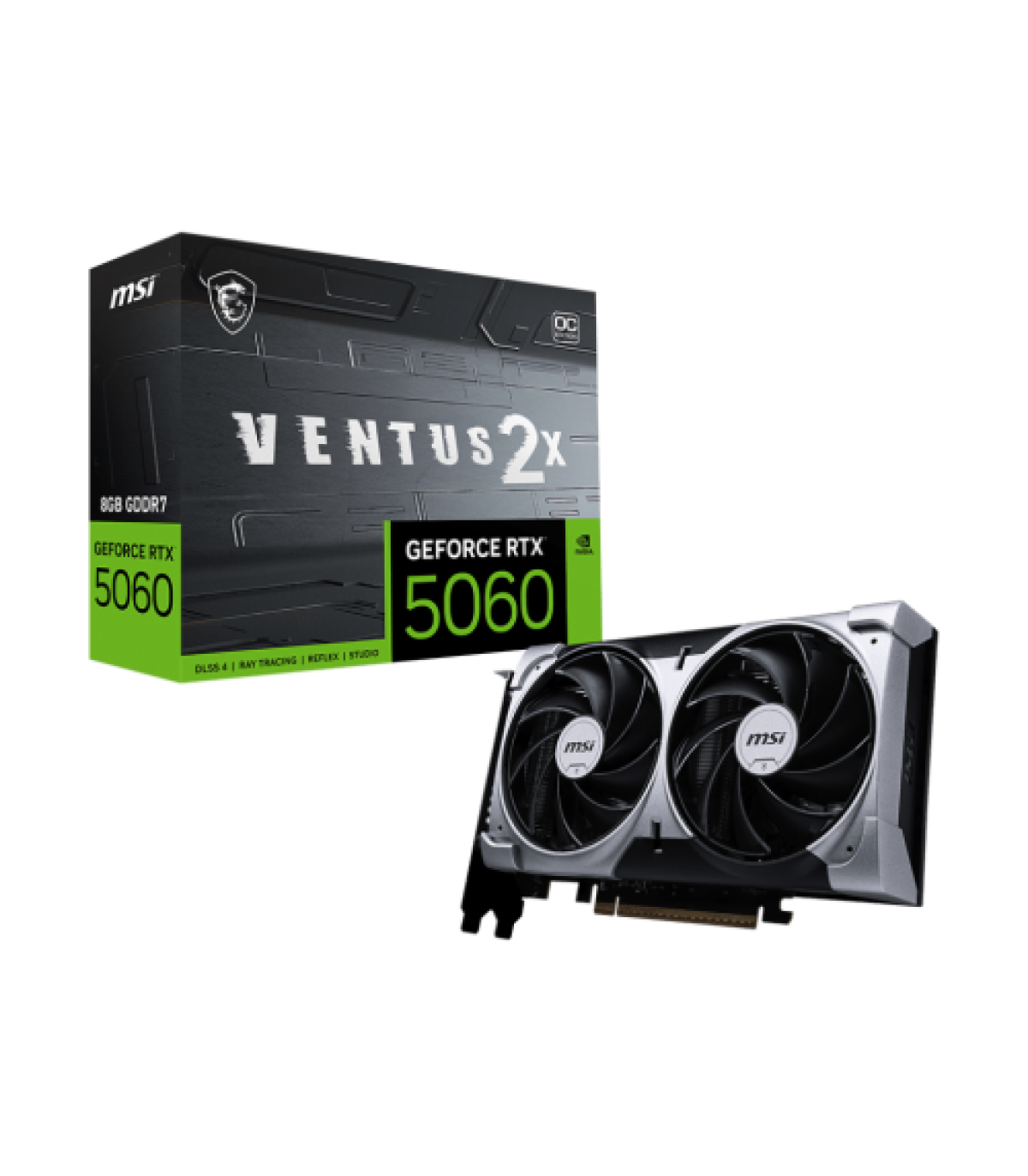 MSI GeForce RTX 5060 8G VENTUS 2X OC. Familia de procesadores de gráficos: NVIDIA, Procesador gráfico: GeForce RTX 5060. Capacidad memoria de adaptador gráfico: 8 GB, Tipo de memoria de adaptador gráfico: GDDR7, Ancho de datos: 128 bit. Máxima resolución: 7680 x 4320 Pixeles. Versión DirectX: 12 Ultimate, Versión OpenGL: 4.6. Tipo de interfaz: PCI Express x16 5.0. Tipo de enfriamiento: Activo, Número de ventiladores: 2 Ventilador(es)