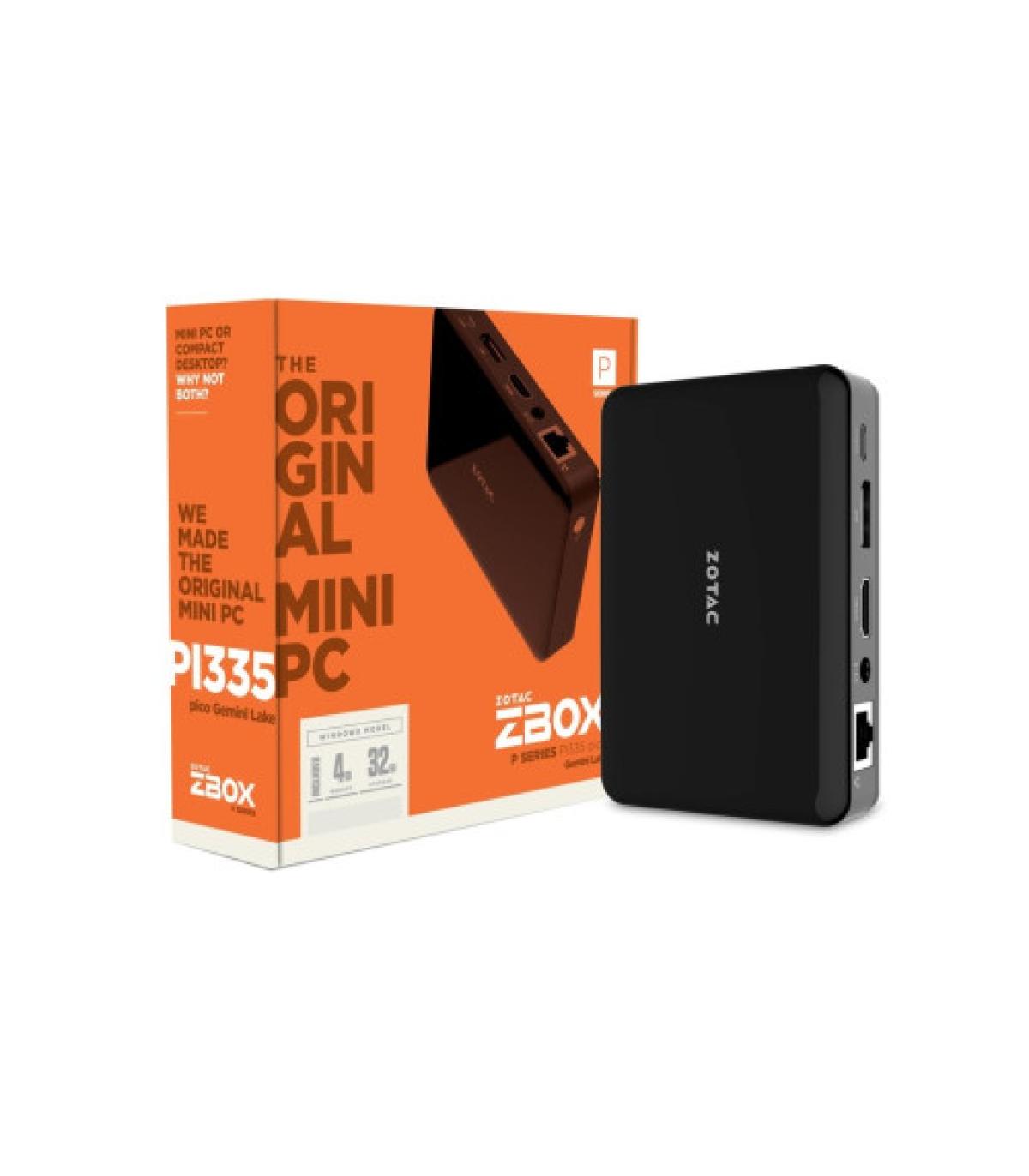 Zotac ZBOX PI335. Frecuencia del procesador: 1,1 GHz, Familia de procesador: Intel® Celeron®, Modelo del procesador: N4100. Memoria interna: 4 GB, Tipo de memoria interna: LPDDR4-SDRAM. Capacidad total de almacenaje: 32 GB, Tarjeta de lectura integrada. Modelo de adaptador gráfico incorporado: Intel® UHD Graphics 600. Wifi. Sistema operativo instalado: Windows 10 Pro. Tipo de chasis: SFF. Tipo de producto: Mini PC. Color del producto: Negro