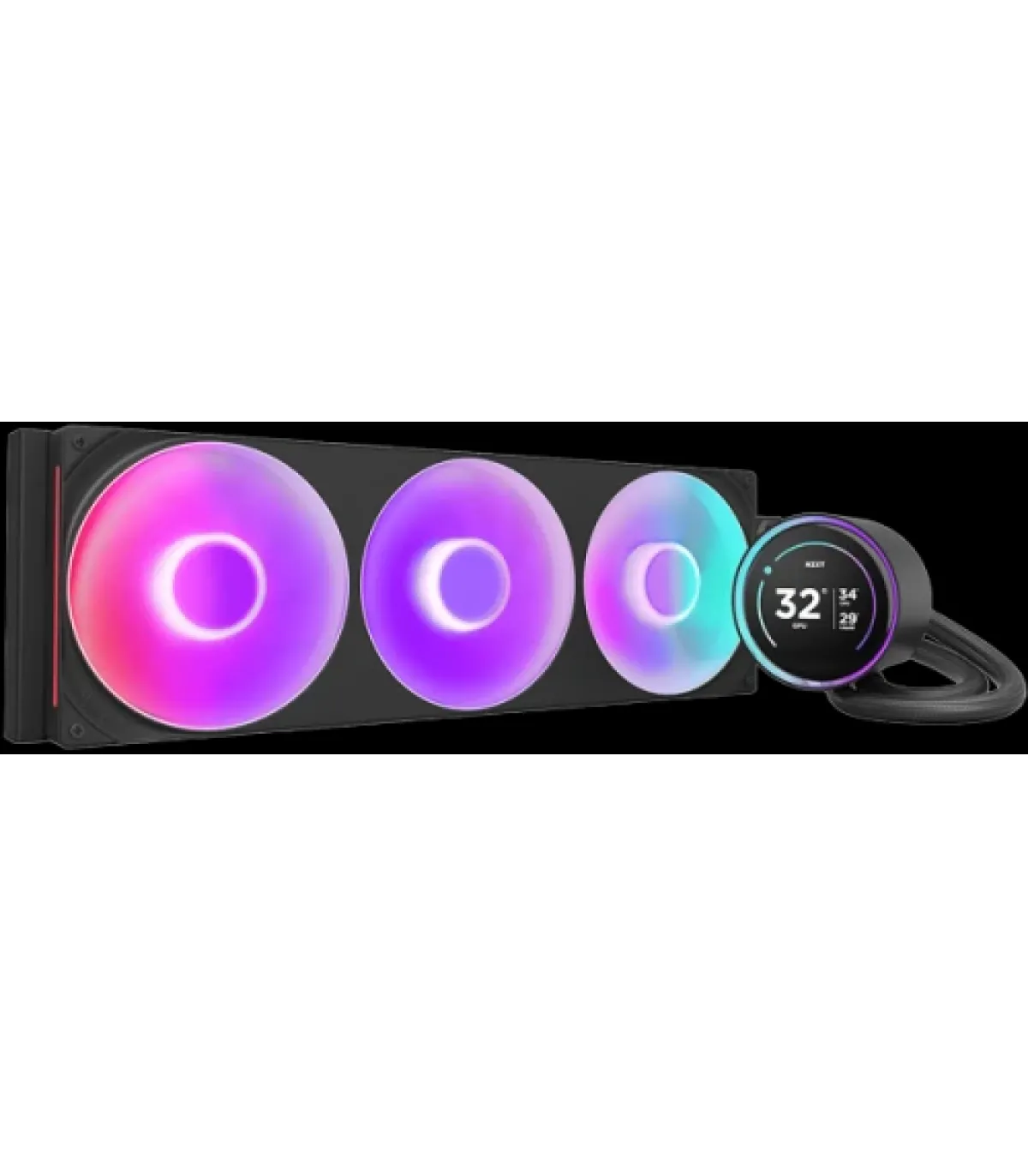 El Kraken Elite V2 es más que un disipador: es una pieza central. Su unidad RGB Core de triple ventilador fusiona tres ventiladores de 140 mm en un solo chasis, generando una alta presión estática con un ruido mínimo, ideal para conjuntos de aletas densos y configuraciones de chasis que priorizan el flujo de aire. Sobre la bomba, una pantalla IPS de 2,72", rodeada por un anillo RGB brillante, añade una capa visual dinámica que muestra la temperatura del sistema, logotipos personalizados o gráficos animados, todo controlado mediante NZXT CAM. En esencia, la bomba de turbina mantiene el refrigerante en movimiento con silenciosa confianza, diseñada para una carga térmica sostenida sin el zumbido ni la vibración habituales. Todo está integrado mediante tubos de malla resistentes, cableado despreocupado y un diseño que luce tan elegante como funciona: sin desorden ni concesiones, solo claridad y control.