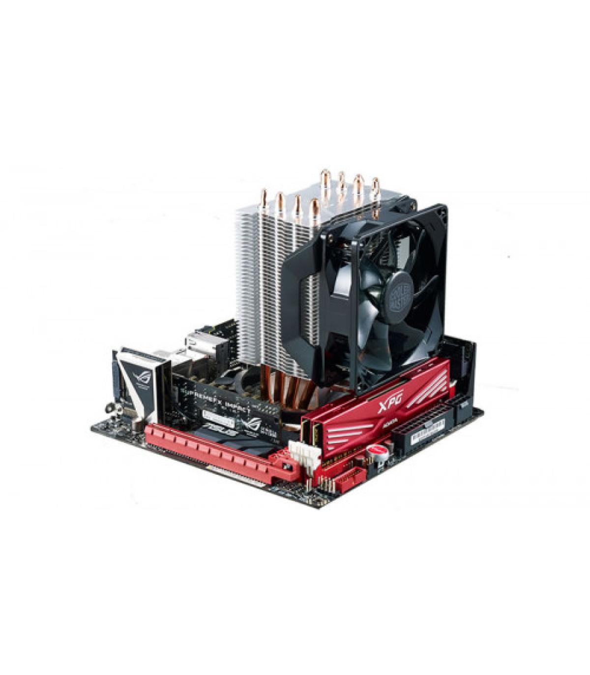 Cooler Master Hyper H411R. Tipo: Enfriador, Diámetro de ventilador: 9,2 cm, Velocidad de rotación (mín.): 600 RPM, Velocidad de rotación (máx.): 2000 RPM, Nivel de ruido (alta velocidad): 29,4 dB, Máximo flujo de aire: 34,1 cfm, Presión máxima de aire: 1,79 mmH2O. Ancho: 83,4 mm, Profundidad: 102 mm, Altura: 136 mm. Color del producto: Negro