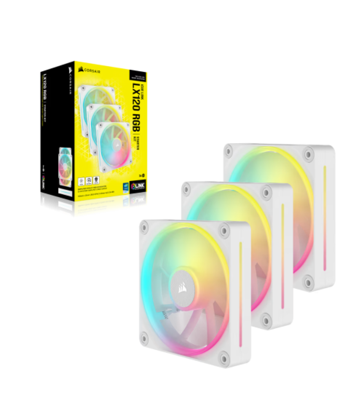 Corsair iCUE LINK LX120 RGB. Tipo: Ventilador, Diámetro de ventilador: 12 cm, Velocidad de rotación (mín.): 400 RPM, Velocidad de rotación (máx.): 2400 RPM, Nivel de ruido (baja velocidad): 10 dB, Nivel de ruido (alta velocidad): 36 dB, Máximo flujo de aire: 69,9 cfm, Presión de aire mínima: 0,13 mmH2O, Presión máxima de aire: 5,22 mmH2O. Ancho: 120 mm, Profundidad: 25 mm, Altura: 120 mm. Color del producto: Blanco
