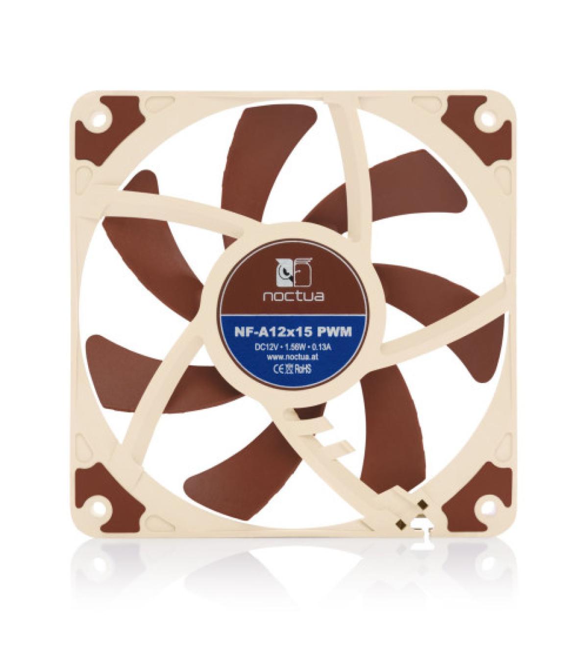 Noctua NF-A12x15 PWM. Tipo: Ventilador, Diámetro de ventilador: 12 cm, Velocidad de rotación (mín.): 450 RPM, Velocidad de rotación (máx.): 1850 RPM, Nivel de ruido (alta velocidad): 23,9 dB, flujo de aire: 94,2 m³/h, Presión de aire mínima: 0,9 mmH2O, Presión máxima de aire: 1,53 mmH2O, Tipo de soporte: Self-Stabilising Oil-pressure Bearing (SSO). Voltaje: 5 - 12 V. Ancho: 120 mm, Profundidad: 120 mm, Altura: 15 mm. Color del producto: Beige, Marrón