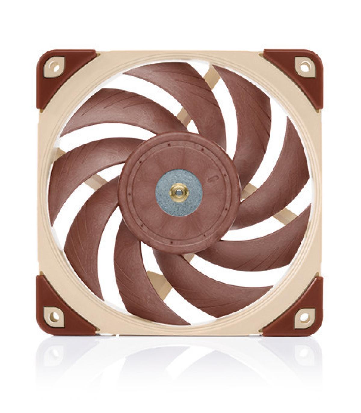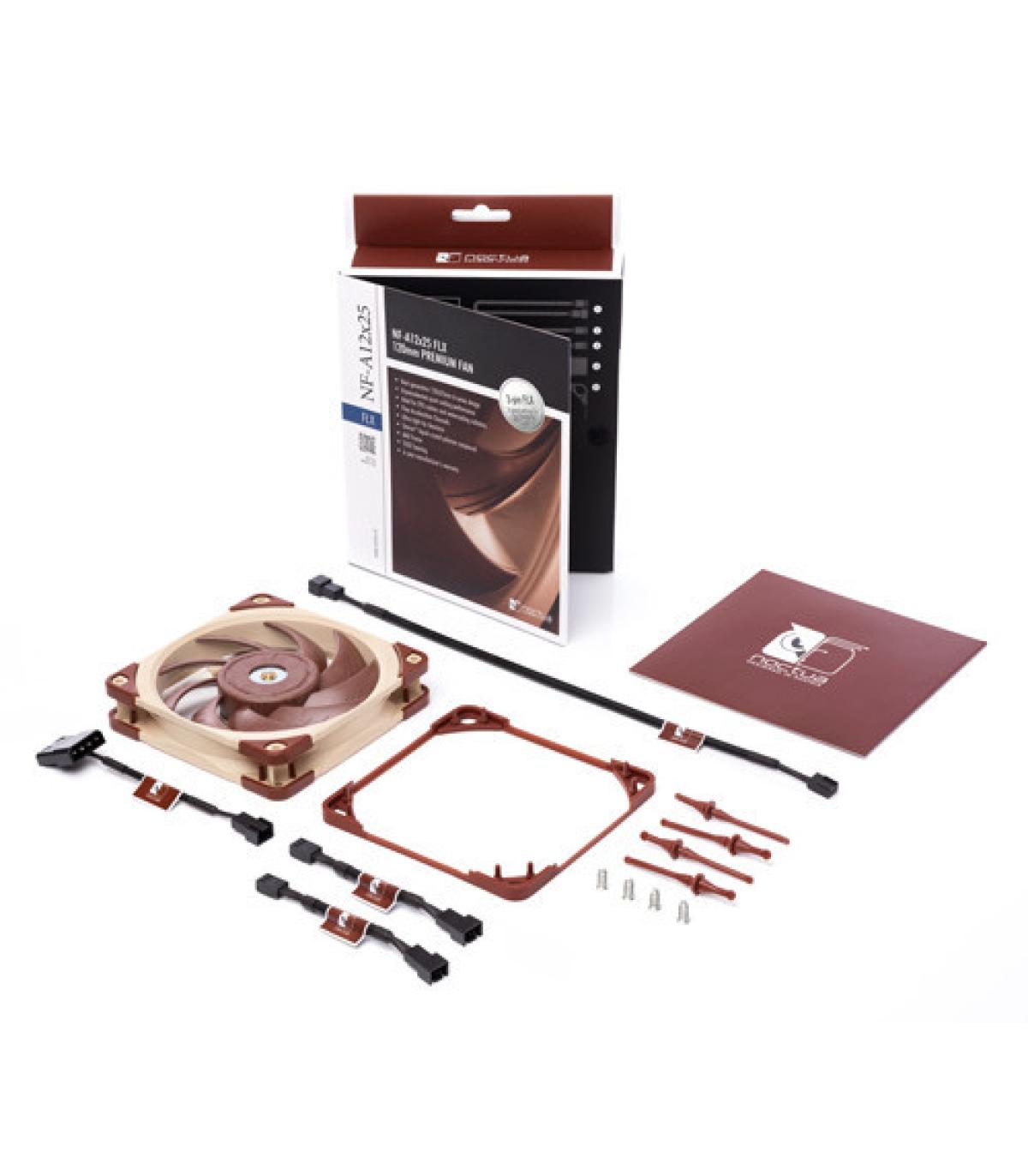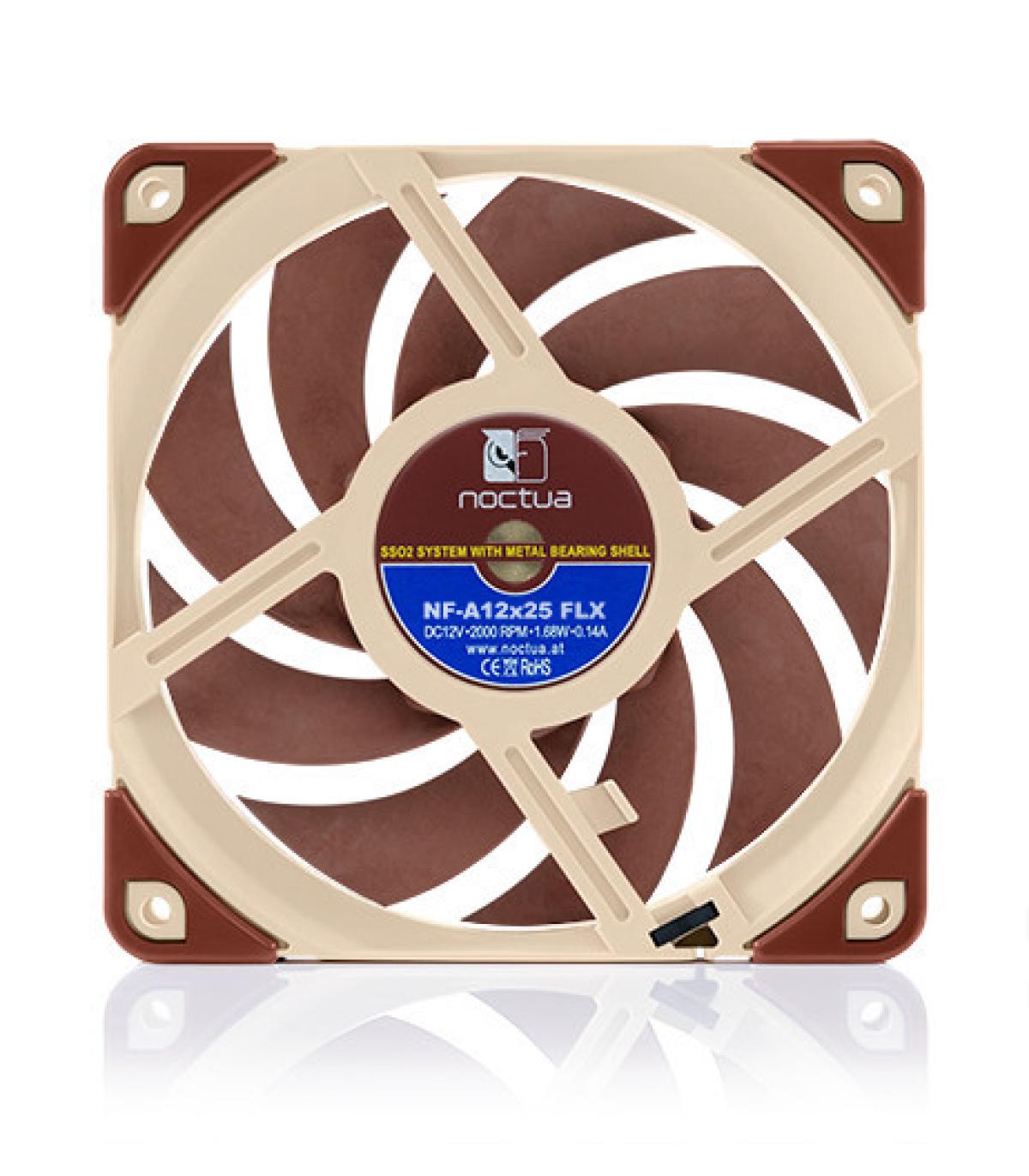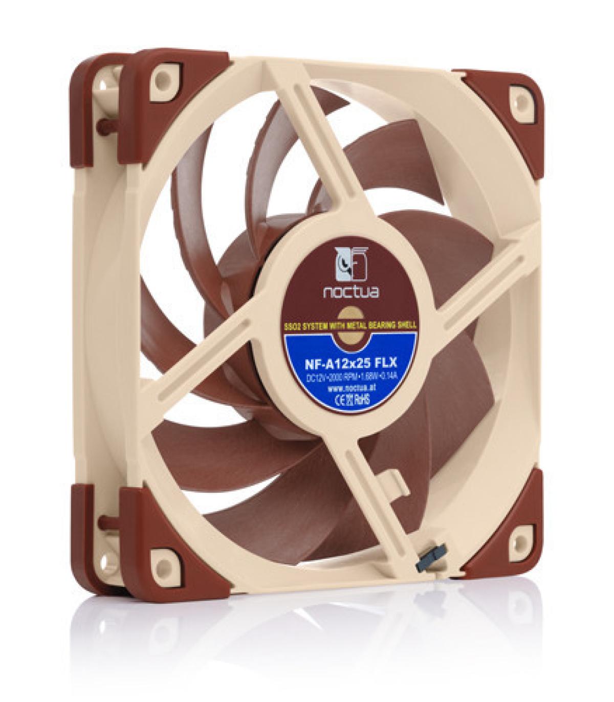 Noctua NF A12x25 FLX. Tipo: Ventilador, Diámetro de ventilador: 12 cm, Número de velocidades: 3, Velocidad de rotación (máx.): 2000 RPM, Nivel de ruido (alta velocidad): 22,6 dB, flujo de aire: 102,1 m³/h, Presión máxima de aire: 2,34 mmH2O, Tipo de soporte: Self-Stabilising Oil-pressure Bearing (SSO). Voltaje: 12 V. Ancho: 120 mm, Profundidad: 25 mm, Altura: 120 mm. Color del producto: Beige, Rojo