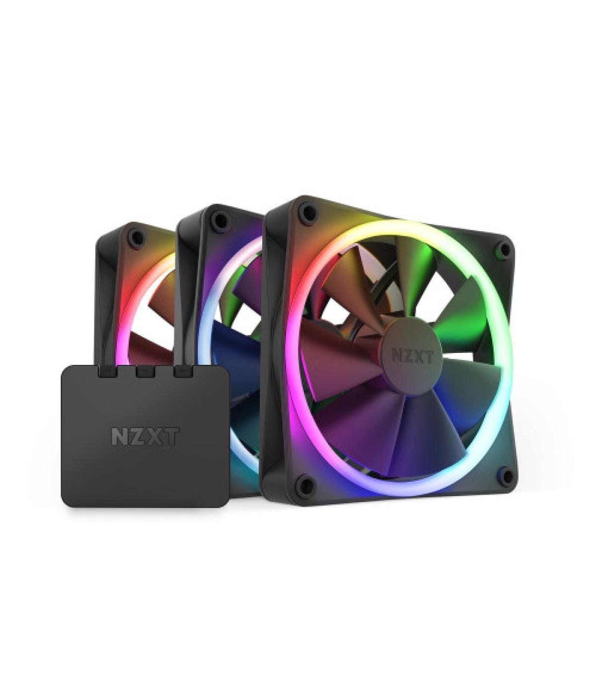 NZXT F120 RGB Triple Pack. Tipo: Ventilador, Diámetro de ventilador: 12 cm, Velocidad de rotación (mín.): 500 RPM, Velocidad de rotación (máx.): 1800 RPM, Nivel de ruido (baja velocidad): 17,2 dB, Nivel de ruido (alta velocidad): 27,5 dB, Máximo flujo de aire: 50,18 cfm, Presión de aire mínima: 0,75 mmH2O, Presión máxima de aire: 2,7 mmH2O, Tipo de soporte: Rodamiento dinámico fluido (FDB). Color del producto: Negro