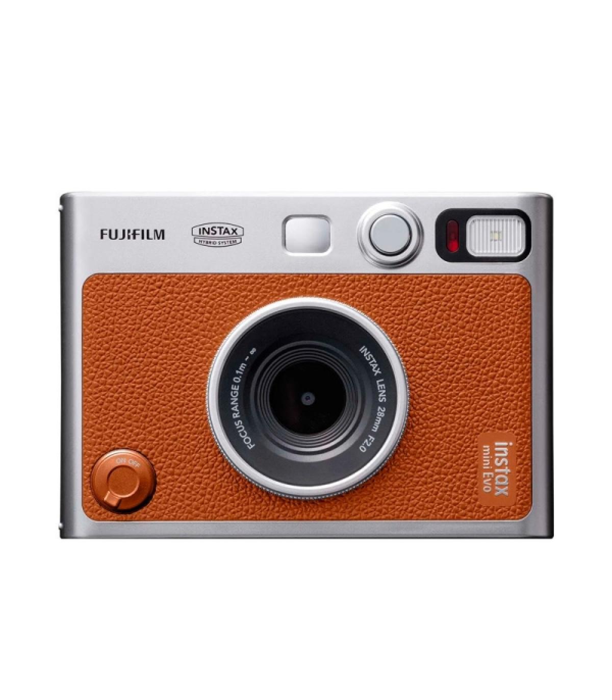 Camara instantanea FUJIFILM Instax mini Evo en color marron y plata, diseño retro de camara antigua, 10 efectos de lente y 10 de pelicula, espejo para selfies integrado al lado de la lente, incluye correa y cable USB de carga.