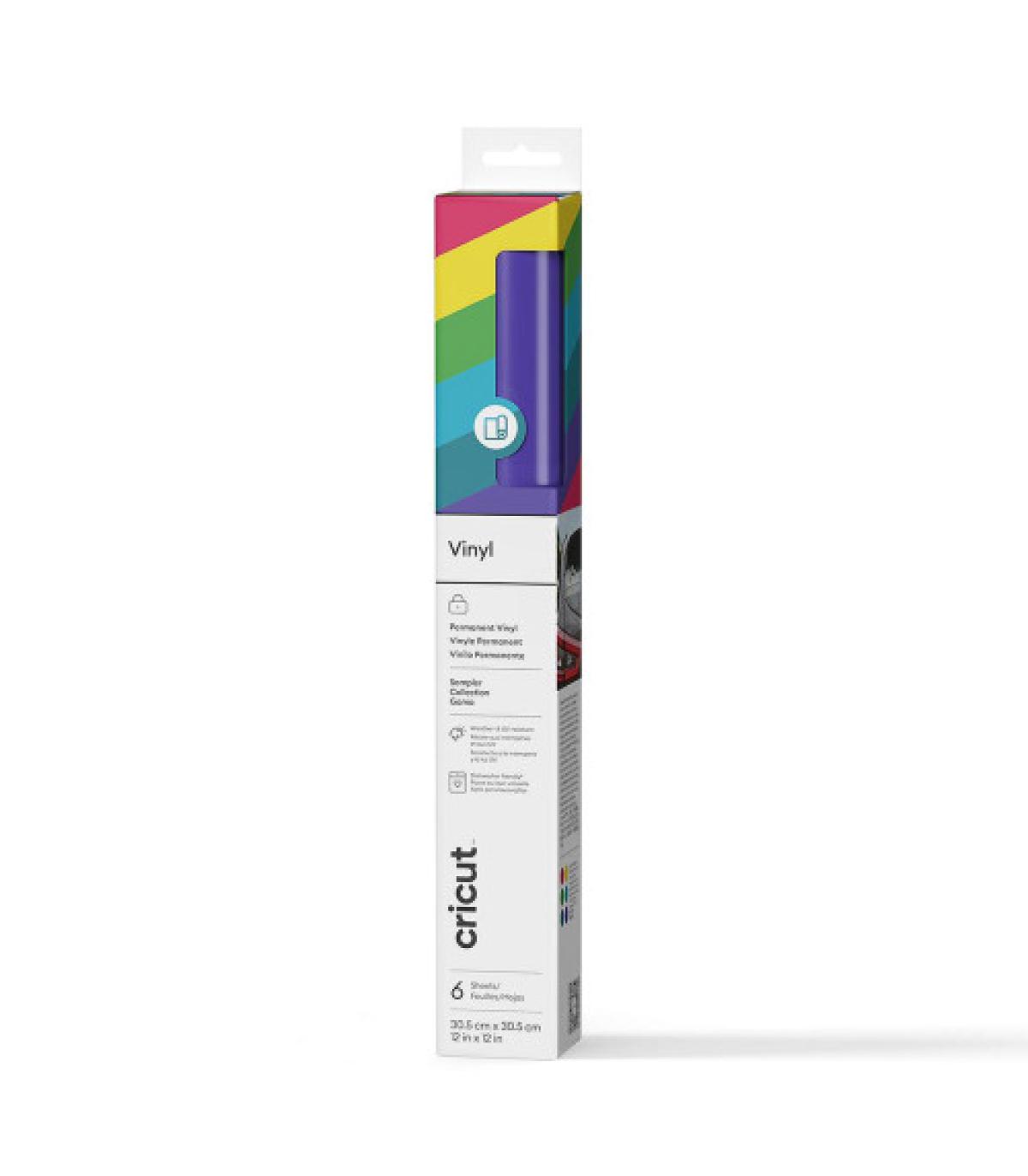Cricut 2011588. Tipo de producto: Lámina de vinilo de transferencia térmica, Tipo: Vinilo de termotransferencia liso, Color del producto: Azul, Verde, Naranja, Púrpura, Rojo, Amarillo. Ancho: 305 mm, Longitud: 305 mm. Tipo de embalaje: Envase para colgar. Hojas por paquete: 6 hojas
