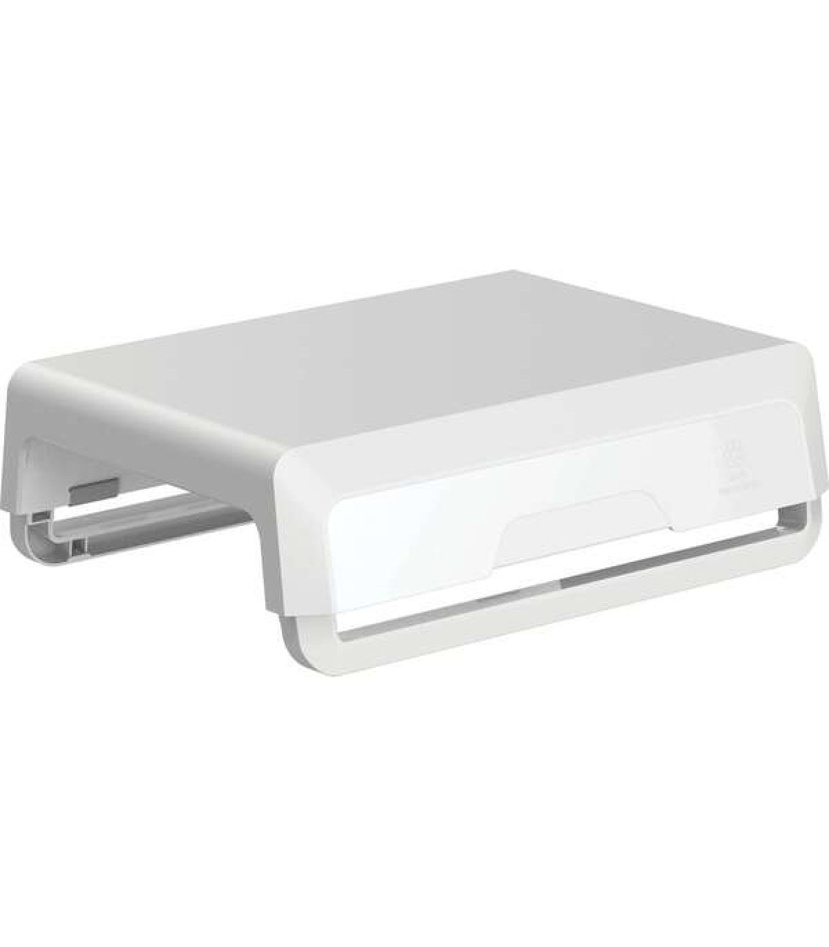 Elevador para monitor con 3 ajustes de altura con un canal para dispositivos con acceso a carga. Ideal para el trabajo híbrido, hecho con materiales 100% reciclados y con una garantía de 5 años.