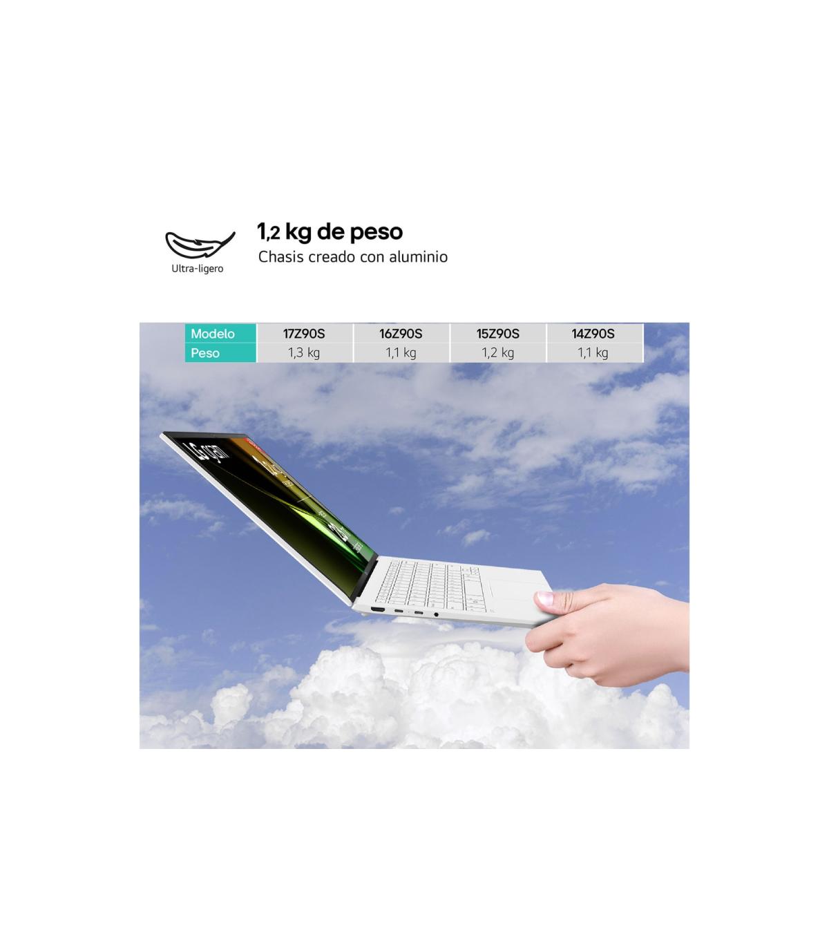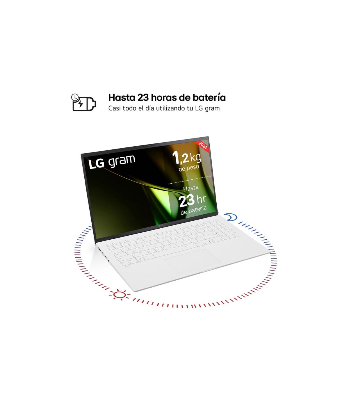 Lg gram de 15 pulgadas laptop. Ultraligero, con tan solo 1,2kg de peso, nueva batería de hasta 23 horas de autonomía* y un grosor de 16,9mm. Windows 11 Home. Pantalla IPS (1920x1080) (WQXGA) con tratamiento antirreflejos de 39,6cm (15") en formato 16:9, con un amplio rango de color DCI-P3 99%.Chasis de aluminio de gran resistencia superando 7 pruebas del estándar militar STD-MIL-810H.Procesador Intel® Core™ Ultra 7, con memoria RAM ultrarrápida LPDDR5x de 16GB integrada en placa y disco duro SSD de 512GB NVMe de 4ª Generación con doble ranura ampliable. Gráfica Intel® Arc™ para trabajar con contenido 4K UHD con la máxima fluidez .Alta conectividad con 6 puertos (2 x USB 3.2, USB Tipo C con Thunderbolt 4 integrado para carga ultrarrápida, USB 3.2 Tipo C compatible con DisplayPort1.4, HDMI 2.1.)