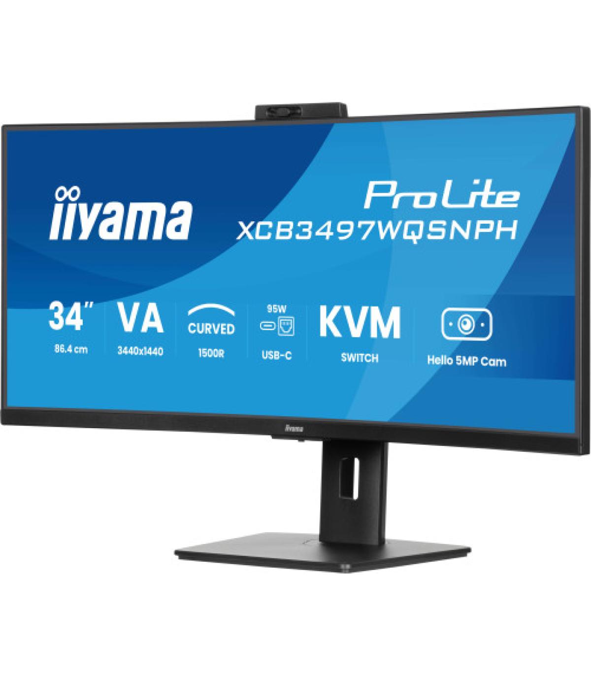 Monitor curvo VA UWQHD de 34'' con cámara y micrófono Windows Hello integrados, base USB-C, LAN, conmutador KVM y soporte ajustable en altura de 15 cm