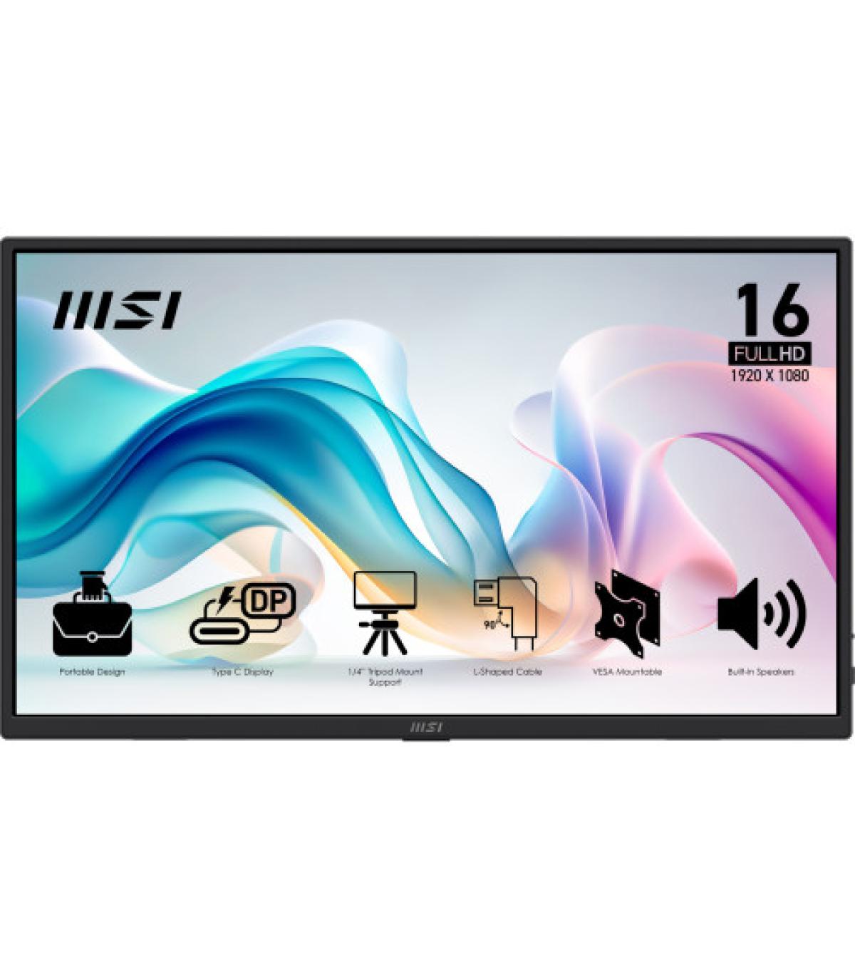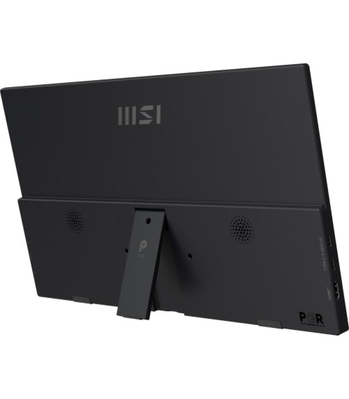 MSI PRO MP165 E6. Diagonal de la pantalla: 39,6 cm (15.6"), Tecnología de visualización: LED, Resolución de la pantalla: 1920 x 1080 Pixeles. Potencia estimada RMS: 1 W. Tipo de puerto USB: USB Tipo C. Tipo de producto: Monitor portátil, Color del producto: Negro, Interfaz de panel de montaje: 75 x 75 mm. Clase de eficiencia energética (SDR): C, Consumo de energía (SDR) por 1000 horas: 7 kWh, Alimentación: USB