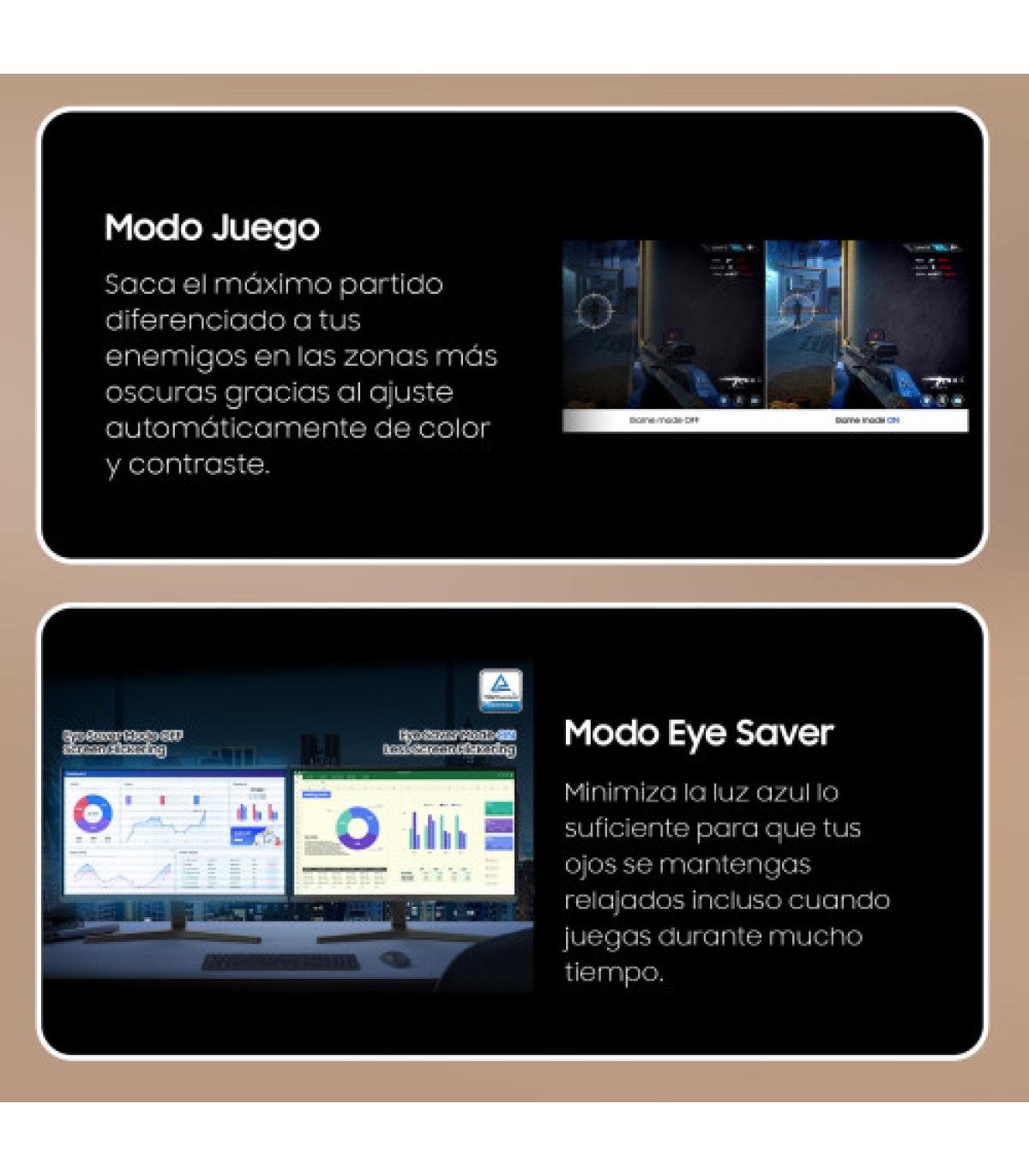 Gana ventaja con los ajustes de juego optimizables. El color y el contraste de la imagen se pueden ajustar al instante para ver las escenas con más viveza y detectar a los enemigos que se esconden en la oscuridad, mientras que el Modo Juego ajusta los juegos para llenar tu pantalla con una visión más detallada.