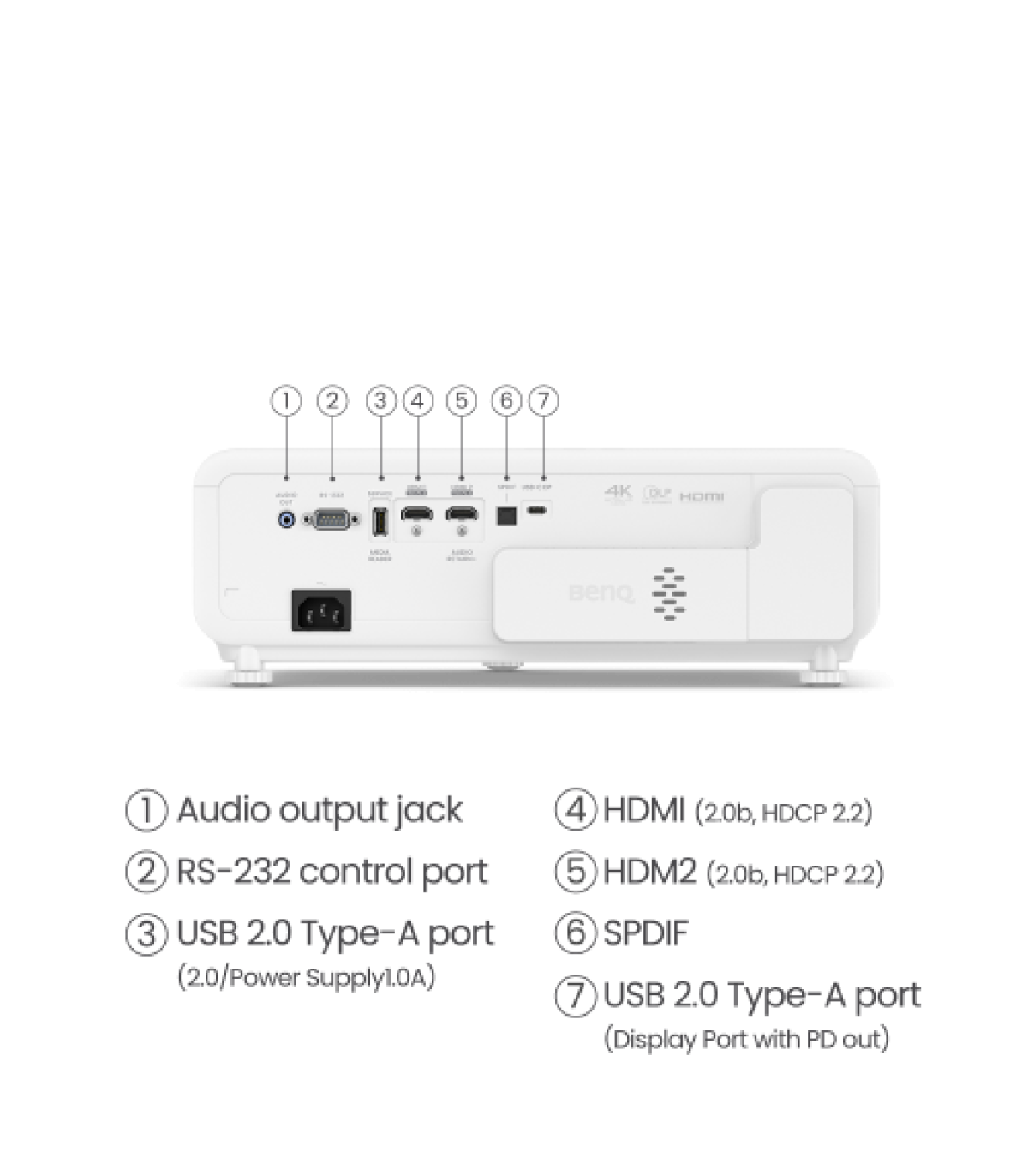 BenQ X500i. Brillo de proyector: 2200 lúmenes ANSI, Tecnología de proyección: DLP, Resolución original del proyector: 2160p (3840x2160). Tipo de fuente luminosa: LED, Duración de la fuente luminosa: 20000 h, Vida útil de la fuente luminosa (modo económico): 30000 h. Intervalo de longitud focal: 10.2~12.24 mm, Rango de apertura: 2,53 - 2,73, Alcance de zoom: 1.2:1. Tipo de serie de interfaz: RS-232. Wi-Fi estándares: 802.11a, 802.11b, 802.11g, Wi-Fi 4 (802.11n), Wi-Fi 5 (802.11ac)
