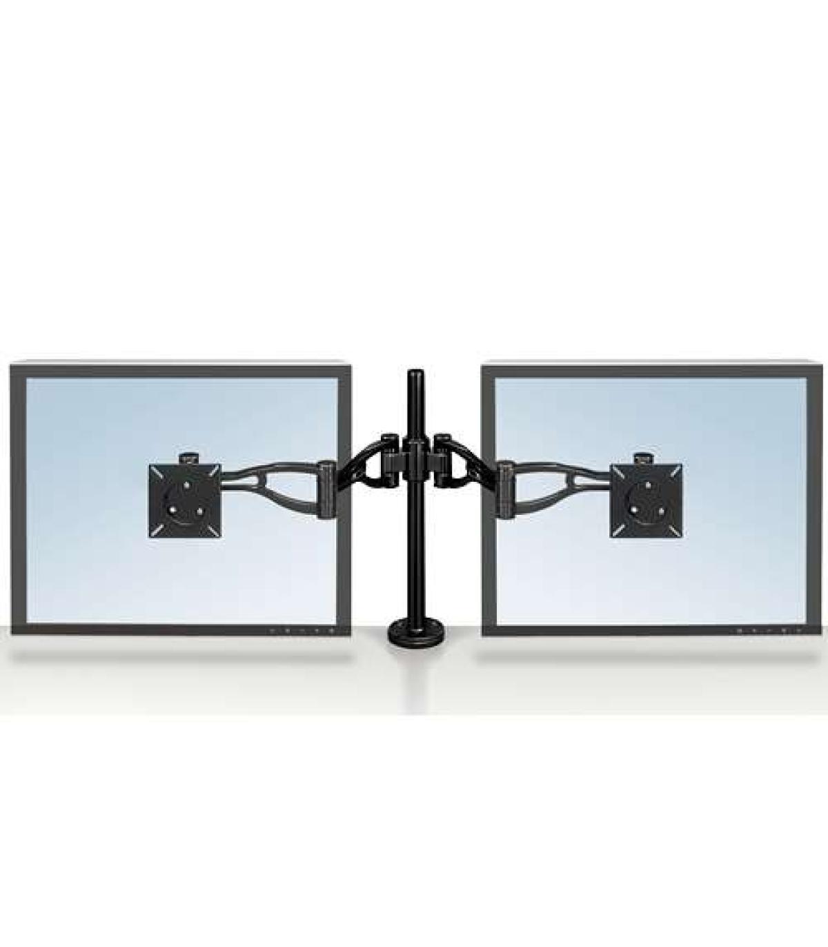 -Soporte con brazo doble que permite colocar dos pantallas, reduciendo espacio en el escritorio y evitando tensiones cuello, espalda y ojos.