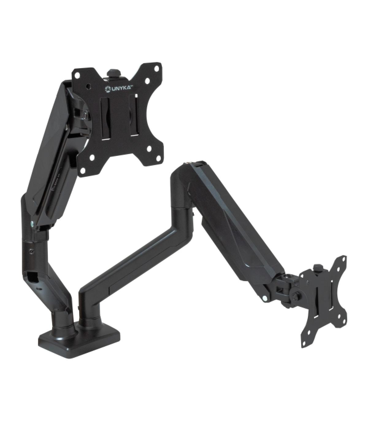 El soporte UNYKAch UK1479 es ideal para televisores o monitores de 13 a 32 (2 kg a 10 kg por brazo), con compatibilidad VESA de 75x75 mm y 100x100 mm. Su diseño de doble brazo, maximiza el espacio en tu escritorio con la instalación de 2 pantallas y permite bascular, inclinar, girar y regular la altura del monitor, reduciendo la tensión en cuello y espalda. Ofrece dos opciones de instalación: abrazadera en C o instalación por hueco pasacables. Con gestión de cables integrada y giro de 360°, garantiza un entorno ordenado y un ajuste perfecto del ángulo de visualización para ambas pantallas.