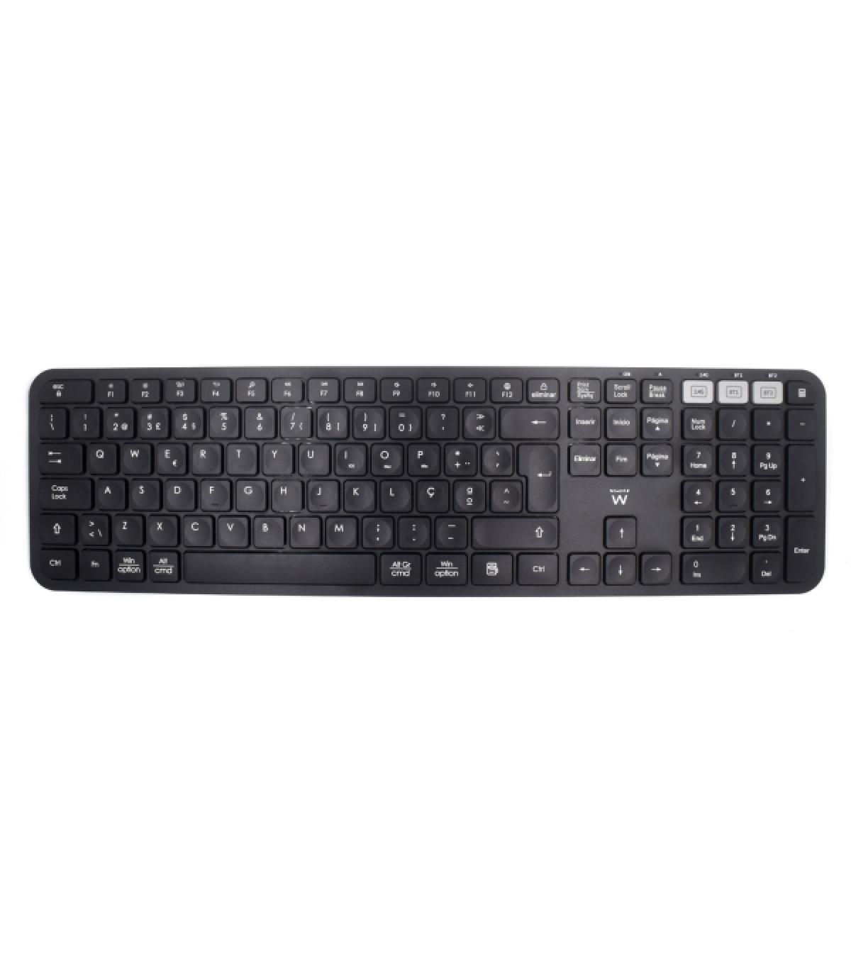 El teclado inalámbrico Ewent EW3275 cuenta con tecnología Bluetooth y 2.4G inalámbrica. Es posible conectar hasta tres dispositivos al mismo tiempo y cambiar entre ellos pulsando el botón dedicado. El teclado es compatible con Windows PC, Mac, iPad, iPhone, portátil, PC, Windows y Android.
