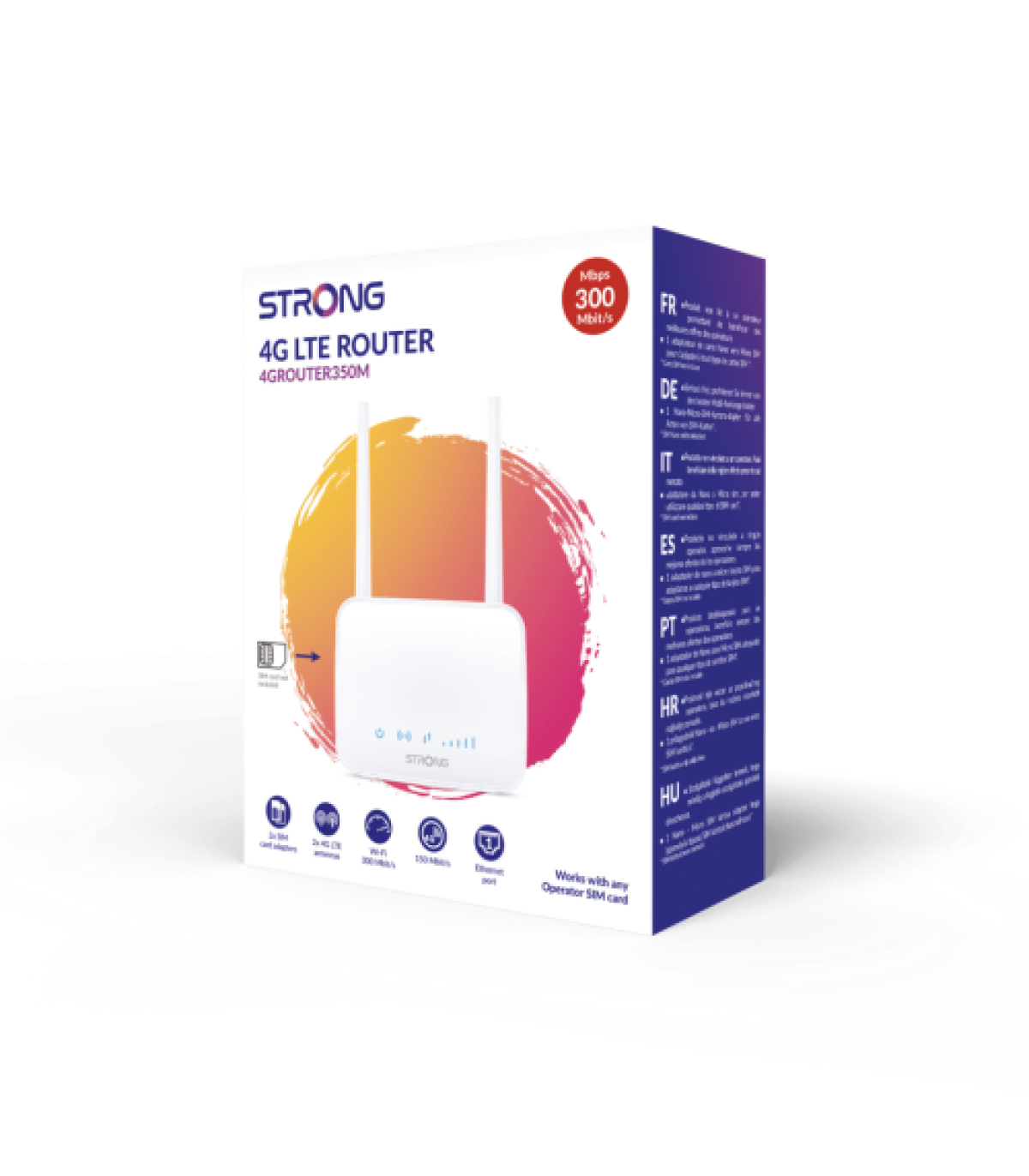 Strong 4GROUTER350M. Tipo de dispositivo: Router de red móvil, Color del producto: Blanco, Posicionamiento de mercado: Hogar. Tipo de interfaz Ethernet LAN: Ethernet rápido, Ethernet LAN, velocidad de transferencia de datos: 10,100 Mbit/s, Estándares de red: IEEE 802.11b, IEEE 802.11g, IEEE 802.11n, IEEE 802.3, IEEE 802.3u. Wi-Fi estándares: 802.11b, 802.11g, Wi-Fi 4 (802.11n), WLAN velocidad de transferencia de datos, soportada: 300 Mbit/s, Frecuencia Wi-Fi: 2,4 GHz. Red de datos: LTE, Estándares 2G: Edge, GPRS, GSM, Estándares 3G: DC-HSPA+, HSPA, HSPA+, UMTS. Algoritmos de seguridad soportados: WPA, WPA-PSK, WPA2, WPA2-PSK, WPS