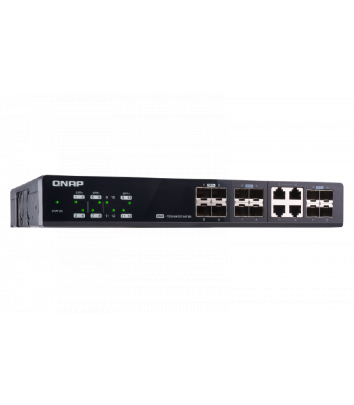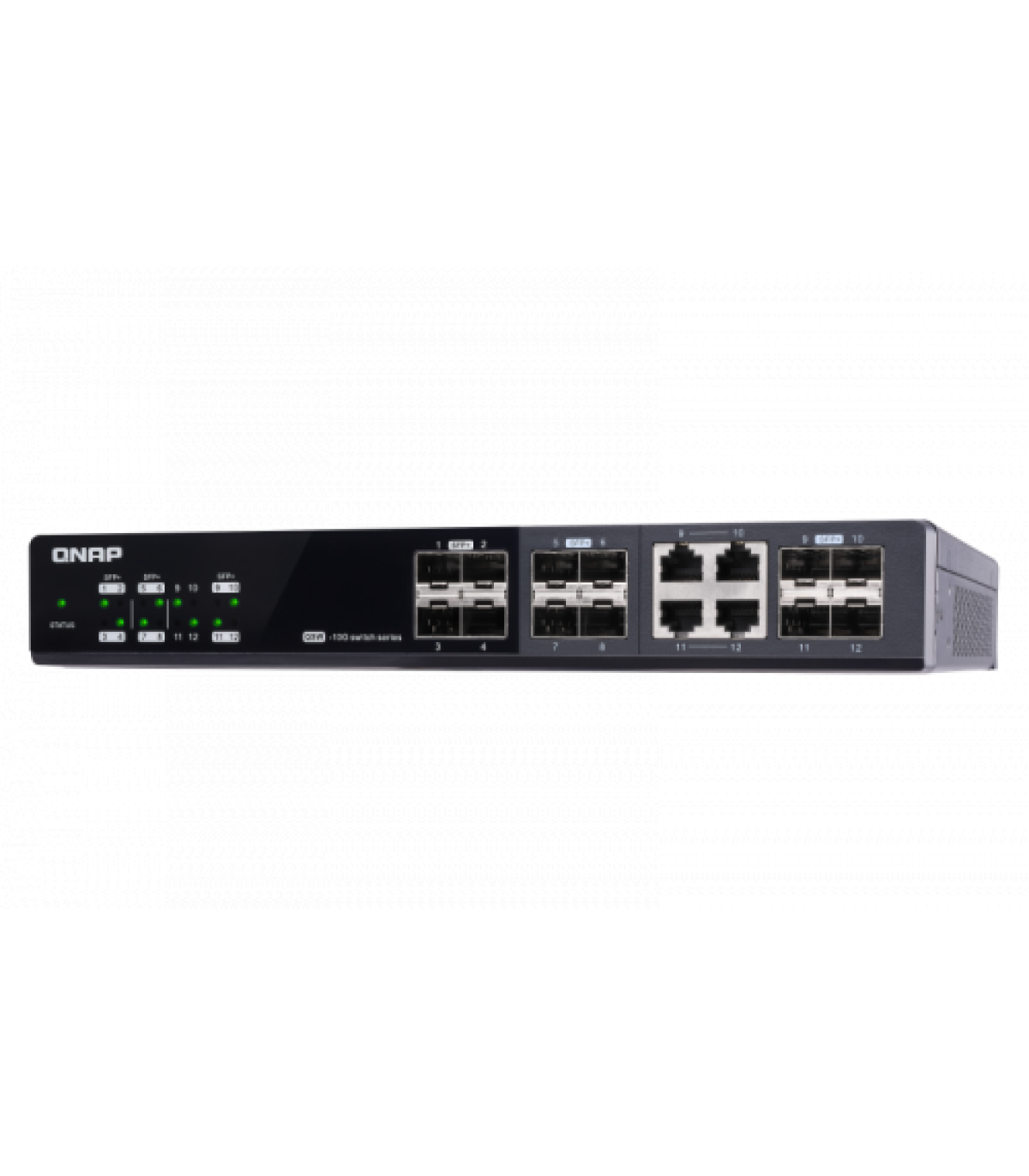 QNAP QSW-M1204-4C. Tipo de interruptor: Gestionado. Puertos tipo básico de conmutación RJ-45 Ethernet: 10G Ethernet (100/1000/10000), Puerto de consola: RJ-45. Bidireccional completo (Full duplex). Tabla de direcciones MAC: 16000 entradas, Capacidad de conmutación: 240 Gbit/s. Estándares de red: IEEE 802.1Q,IEEE 802.1ab,IEEE 802.1p,IEEE 802.1w,IEEE 802.3,IEEE 802.3ab,IEEE 802.3ad,IEEE.... Montaje en rack