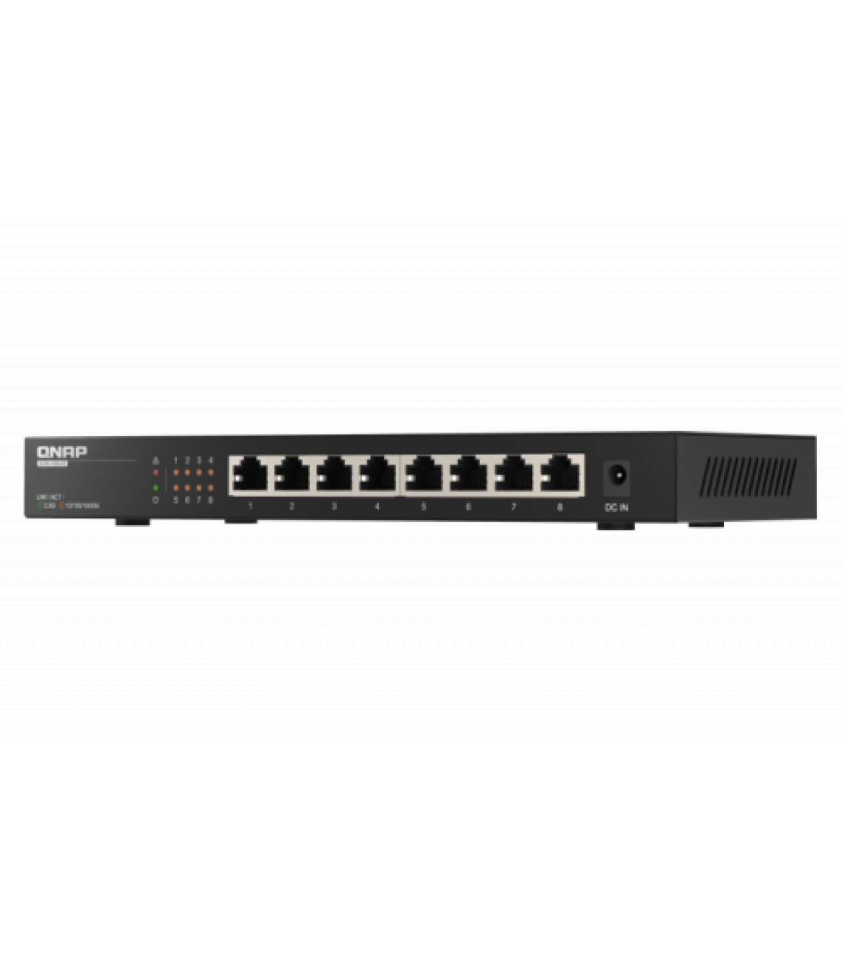 QNAP QSW-1108-8T. Tipo de interruptor: No administrado. Puertos tipo básico de conmutación RJ-45 Ethernet: 2.5G Ethernet (100/1000/2500), Cantidad de puertos básicos de conmutación RJ-45 Ethernet: 8. Bidireccional completo (Full duplex). Tabla de direcciones MAC: 16000 entradas, Capacidad de conmutación: 40 Gbit/s. Estándares de red: IEEE 802.3,IEEE 802.3ab,IEEE 802.3az,IEEE 802.3bz,IEEE 802.3u,IEEE 802.3x. Voltaje de entrada DC: 12 V