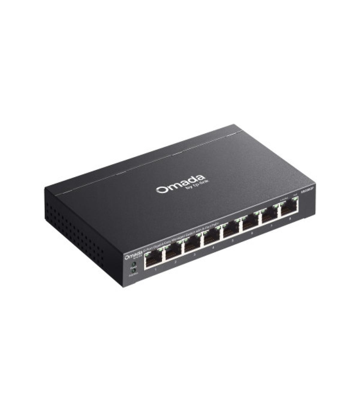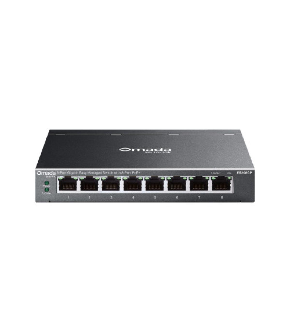 TP-Link Omada ES208GP. Tipo de interruptor: Gestionado, Capa del interruptor: L2. Puertos tipo básico de conmutación RJ-45 Ethernet: Gigabit Ethernet (10/100/1000), Cantidad de puertos básicos de conmutación RJ-45 Ethernet: 8. Tabla de direcciones MAC: 8000 entradas, Capacidad de conmutación: 16 Gbit/s. Estándares de red: IEEE 802.3af, IEEE 802.3at, IEEE 802.3bt. Voltaje de entrada DC: 53 V. Energía sobre Ethernet (PoE). Montaje en rack, Factor de forma: DIN rail