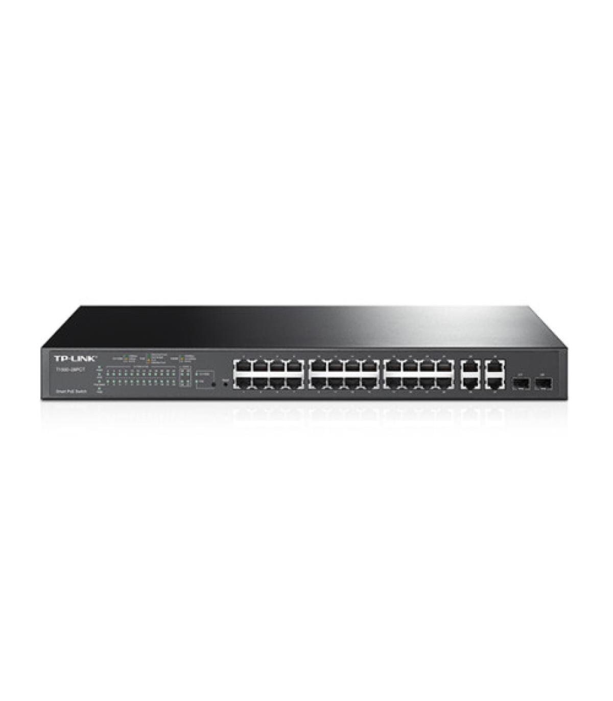 ¿Para qué Sirve este Producto?El T1500-28PCT incorpora 24 puertos 10/100Mbps que soportan el estándar PoE 802.3at/af, con una potencia total de alimentación de hasta 180W, lo suficientemente potente y flexible para usuarios que necesiten desplegar una red de puntos de acceso inalámbricos o de cámaras de vigilancia IP. El switch también viene equipado con 4 puertos 10/100/1000Mbps RJ45 y 2 ranuras combo SFP, expandiendo la flexibilidad de su red. Además, proporciona un alto rendimiento, QoS de nivel empresarial, útiles estrategias de seguridad y diversas características de gestión de capa 2.El switch TP-LINK Smart PoE T1500-28PCT es una solución económica para las pequeñas y medianas empresas. El T1500-28PCT tiene interesantes características de seguridad. La característica de Control de Tormentas protege contra Tormentas Broadcast, Multicast y Unicast desconocidas. La Calidad de Servicio (QoS L2 a L4) proporciona capacidades de gestión de tráfico avanzadas para mover sus datos de manera más estable y rápida. Nunca la interfaz de gestión web fue tan fácil de utilizar, a través de SNMP y RMON, proporcionan una manera más sencilla de configuración con un menor tiempo de inactividad. Para grupos de trabajo y departamentos que requieren un switch de capa 2 económico, el switch TP-LINK Smart PoE T1500-28PCT proporciona una solución ideal de acceso de última generación.Power over Ethernet IEEE 802.3at/afEl T1500-28PCT incorpora 24 puertos que soportan el estándar IEEE 802.3at/af con una potencia total de alimentación de 180W que proporciona alimentación a dispositivos compatibles con los estándares 802.3at y 802.3af. Es una elección eficiente y económica para trabajar con puntos de acceso, cámaras de vigilancia, teléfonos IP y otros dispositivos que soporten PoE, de este modo podrá librarse de cables o fuentes de alimentación situados alrededor. Compacto y flexible, el T1500-28PCT es ideal para un uso PoE flexible para desplegar puntos de acceso inalámbricos o redes de cámaras de vigilancia IP para proyectos o redes de pequeñas empresas.Funcionalidades QoS AvanzadasPara integrar voz, datos y servicio de vídeo en una sola red, el switch aplica políticas avanzadas de QoS. El administrador puede designar la prioridad del tráfico basado en una variedad de medios incluyendo Prioridad por Puerto, Prioridad 802.1P y Prioridad DSCP, para asegurar que la voz y el vídeo sean siempre claros, sin cortes y sin retardos. Junto con la VLAN de voz, el switch soporta que aplicaciones de voz operen con un rendimiento mucho más fluido.Múltiples Funcionalidades de Capa 2Para una mayor aplicación de los switches de capa 2, el T1500-28PCT soporta una línea completa de funcionalidades de capa 2, incluyendo etiquetado VLAN 802.1Q, Aislamiento de Puerto, Port Mirroring, STP/RSTP/MSTP, Grupos de Agregación de Enlaces y Control de Flujo 802.3x. Nunca los switches proporcionaron funcionalidades tan avanzadas para el mantenimiento de su red como Detección Loop Back, Diagnóstico del Cable e IGMP Snooping. IGMP Snooping asegura que el switch, de manera inteligente, transmita el tráfico multicast solo a los suscriptores apropiados mientras que IGMP throttling & filtering restringe a cada suscriptor a nivel de puerto, para prevenir el acceso multicast no autorizado.Funcionalidades de Gestión de Nivel EmpresarialEl T1500-28PCT es fácil de utilizar y gestionar. Soporta varias funcionalidades estándar de gestión amigables, como un intuitivo Interfaz Gráfico de Usuario web (GUI) o SNMP (v1/2/3) y RMON que soporta la habilitación del switch para ser sondeado sobre información de su estado y enviar trampas a los eventos extraños.