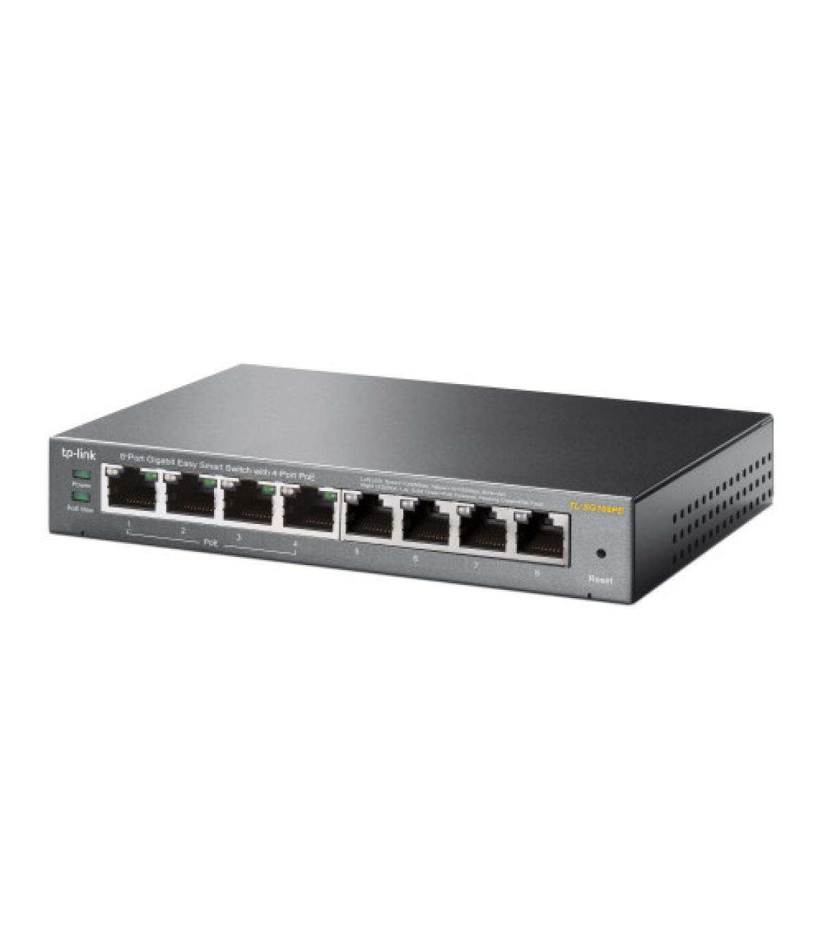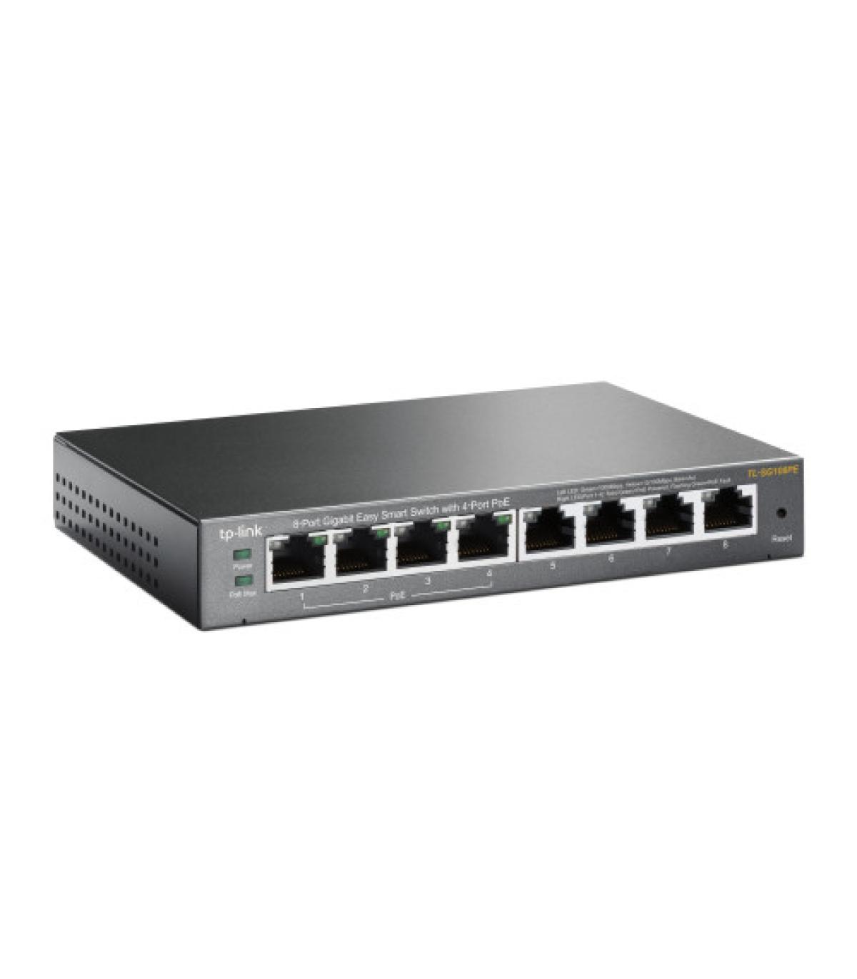 TP-LINK TL-SG108PE. Tipo de interruptor: No administrado. Puertos tipo básico de conmutación RJ-45 Ethernet: Gigabit Ethernet (10/100/1000), Cantidad de puertos básicos de conmutación RJ-45 Ethernet: 8. Tabla de direcciones MAC: 4000 entradas, Capacidad de conmutación: 16 Gbit/s. Estándares de red: IEEE 802.1Q,IEEE 802.1p,IEEE 802.3ab,IEEE 802.3i,IEEE 802.3u,IEEE 802.3x. Voltaje de entrada DC: 48 V. Energía sobre Ethernet (PoE)