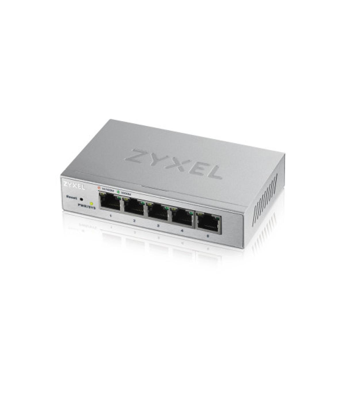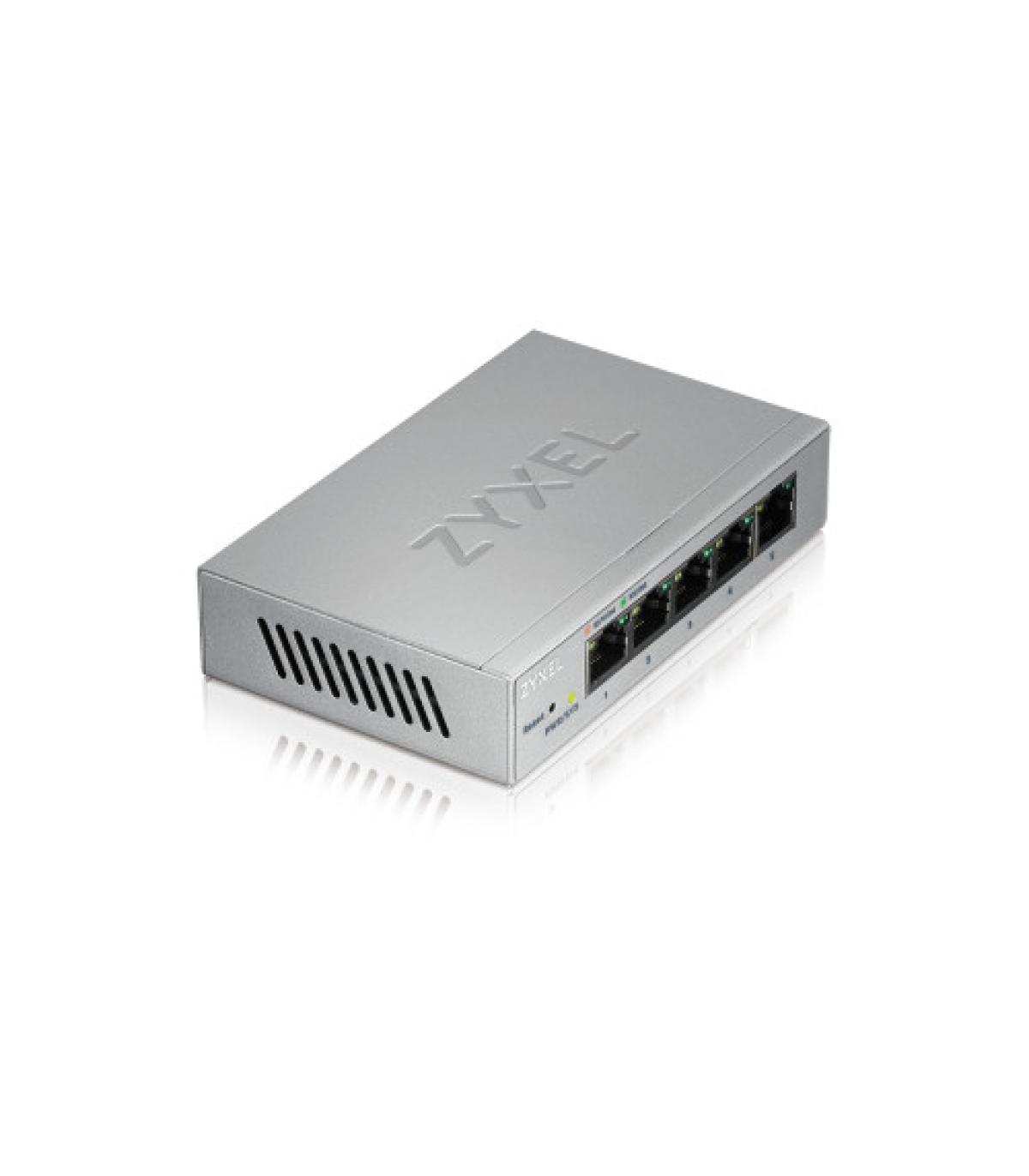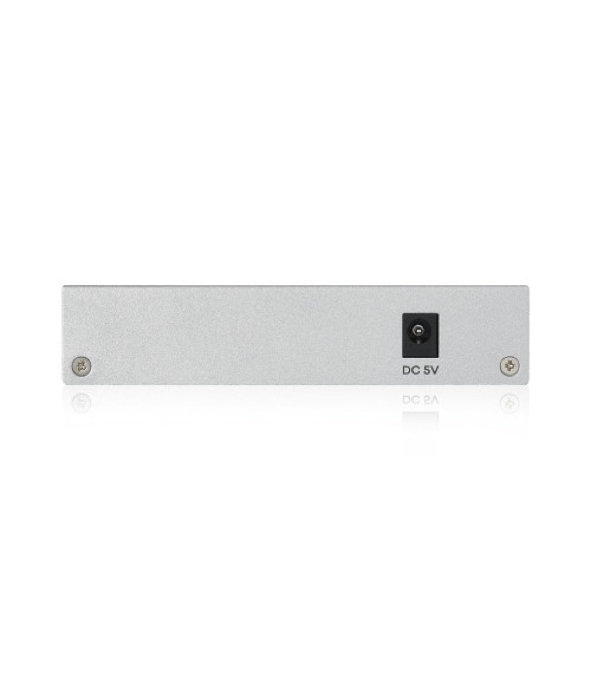 Zyxel GS1200-5. Tipo de interruptor: Gestionado. Puertos tipo básico de conmutación RJ-45 Ethernet: Gigabit Ethernet (10/100/1000), Cantidad de puertos básicos de conmutación RJ-45 Ethernet: 5. Tabla de direcciones MAC: 2000 entradas, Capacidad de conmutación: 10 Gbit/s. Estándares de red: IEEE 802.1Q,IEEE 802.1p,IEEE 802.3ab,IEEE 802.3az,IEEE 802.3u,IEEE 802.3x,IEEE 802.3z. Voltaje de entrada DC: 5 V. Conector eléctrico: Toma de entrada de CC