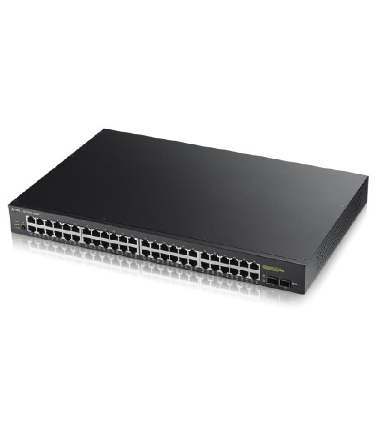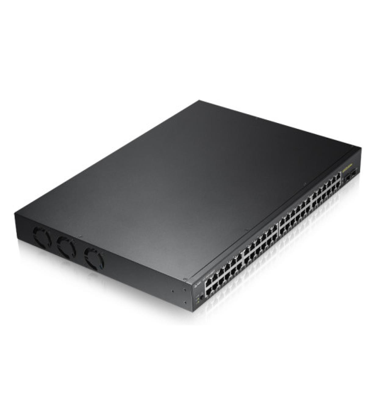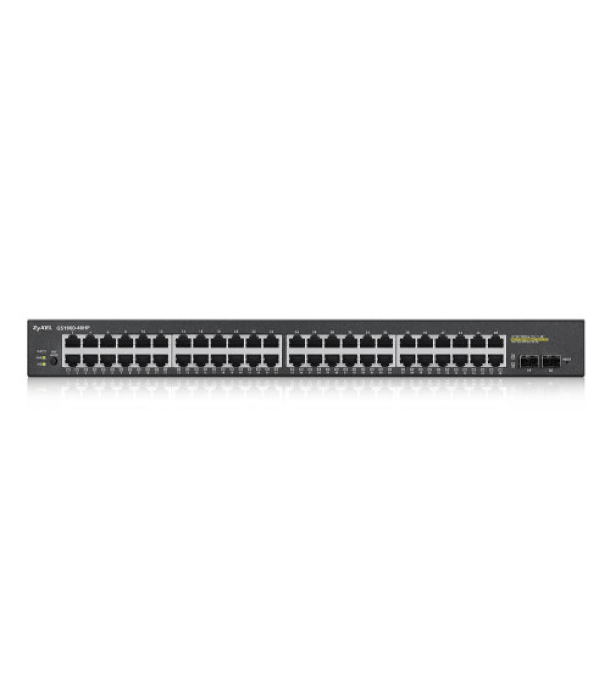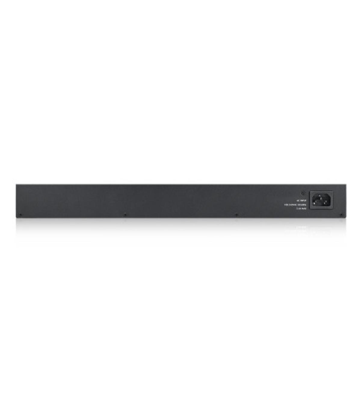 Zyxel GS1900-48HP. Tipo de interruptor: Gestionado, Capa del interruptor: L2. Puertos tipo básico de conmutación RJ-45 Ethernet: Gigabit Ethernet (10/100/1000), Cantidad de puertos básicos de conmutación RJ-45 Ethernet: 48. Bidireccional completo (Full duplex). Tabla de direcciones MAC: 8000 entradas, Capacidad de conmutación: 100 Gbit/s. Estándares de red: IEEE 802.1p,IEEE 802.1Q,IEEE 802.3,IEEE 802.3ab,IEEE 802.3ad,IEEE 802.3af,IEEE 802.3at,IEEE.... Conector eléctrico: Toma de entrada de CC. Montaje en rack