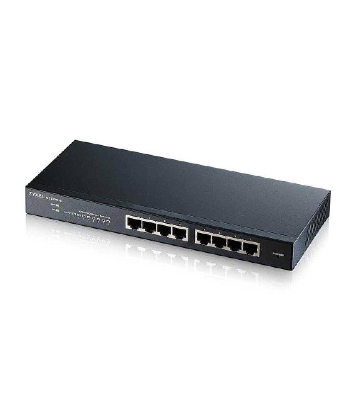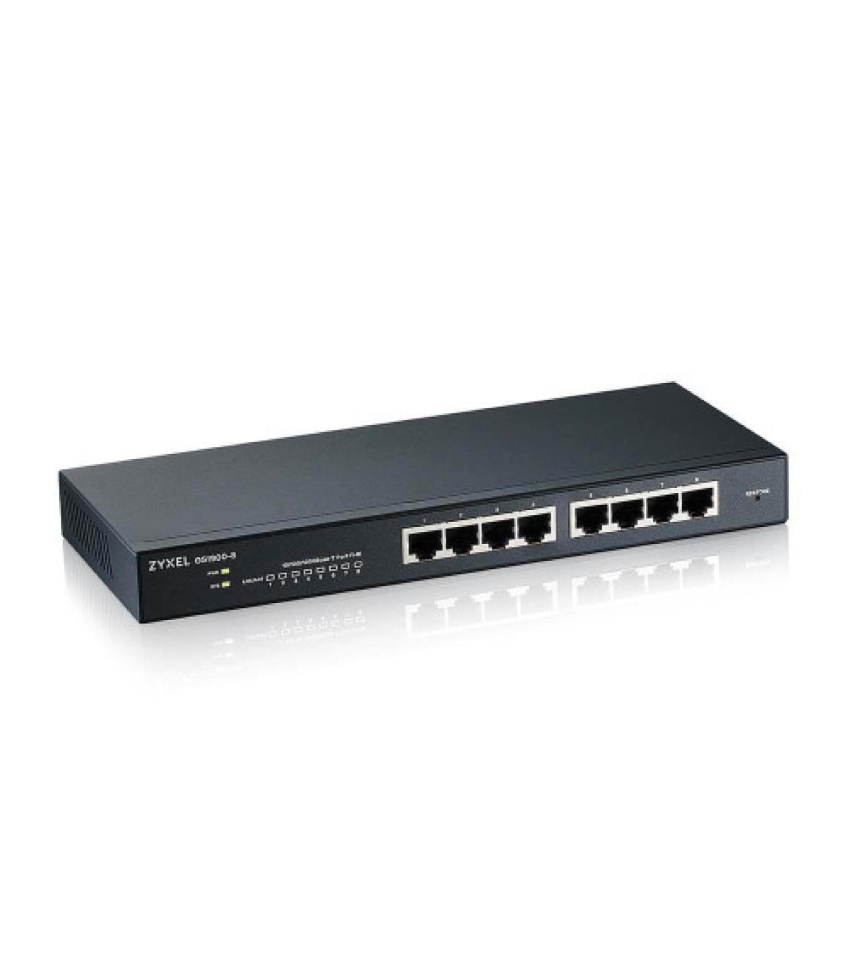 Zyxel GS1900-8. Tipo de interruptor: Gestionado, Capa del interruptor: L2. Puertos tipo básico de conmutación RJ-45 Ethernet: Gigabit Ethernet (10/100/1000), Cantidad de puertos básicos de conmutación RJ-45 Ethernet: 8. Bidireccional completo (Full duplex). Tabla de direcciones MAC: 8000 entradas, Capacidad de conmutación: 16 Gbit/s. Estándares de red: IEEE 802.1Q, IEEE 802.1p, IEEE 802.1x, IEEE 802.3, IEEE 802.3ab, IEEE 802.3ad, IEEE 802.3af, IEEE.... Conector eléctrico: Toma de entrada de CC. Montaje en rack