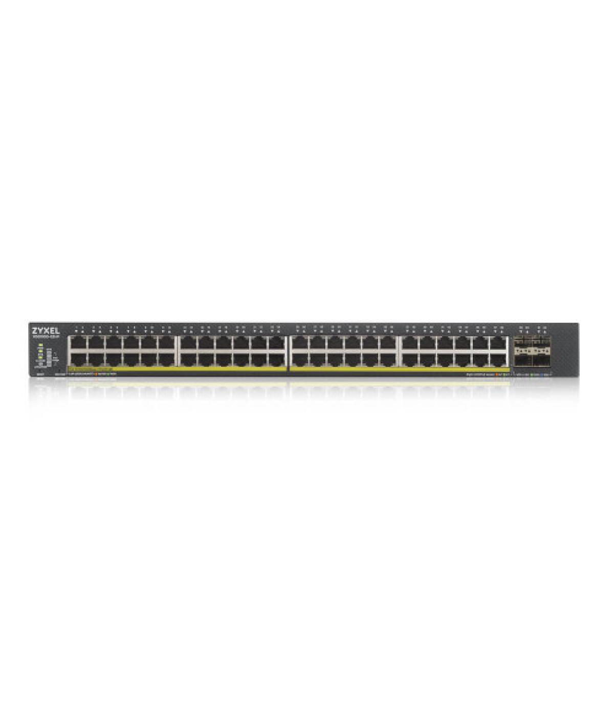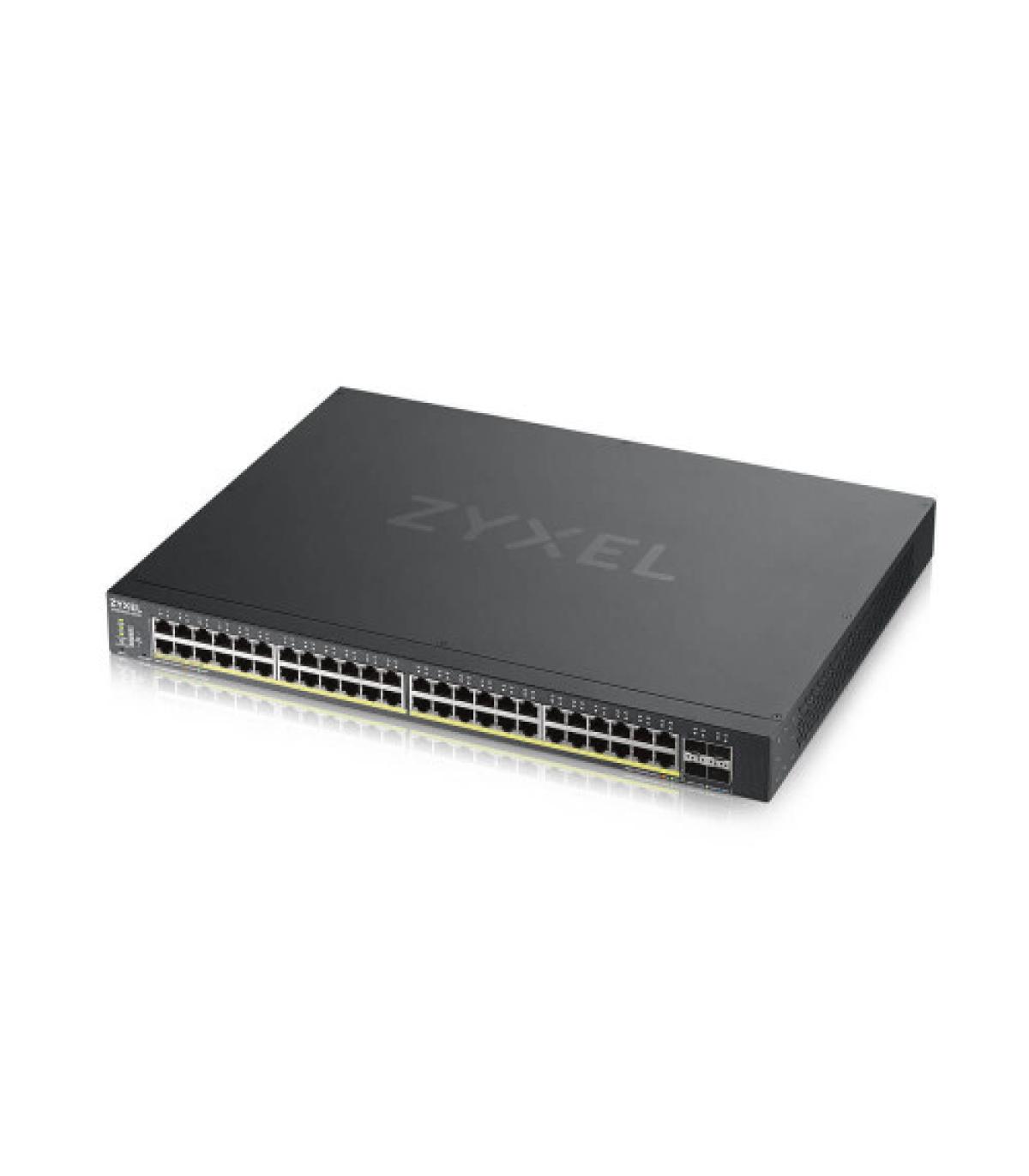 Zyxel XGS1930-52HP. Tipo de interruptor: Gestionado, Capa del interruptor: L3. Puertos tipo básico de conmutación RJ-45 Ethernet: Gigabit Ethernet (10/100/1000), Cantidad de puertos básicos de conmutación RJ-45 Ethernet: 48. Tabla de direcciones MAC: 16000 entradas, Capacidad de conmutación: 176 Gbit/s. Estándares de red: IEEE 802.1D,IEEE 802.1Q,IEEE 802.1ab,IEEE 802.1p,IEEE 802.1s,IEEE 802.1w,IEEE 802.1x,IEEE.... Energía sobre Ethernet (PoE). Montaje en rack