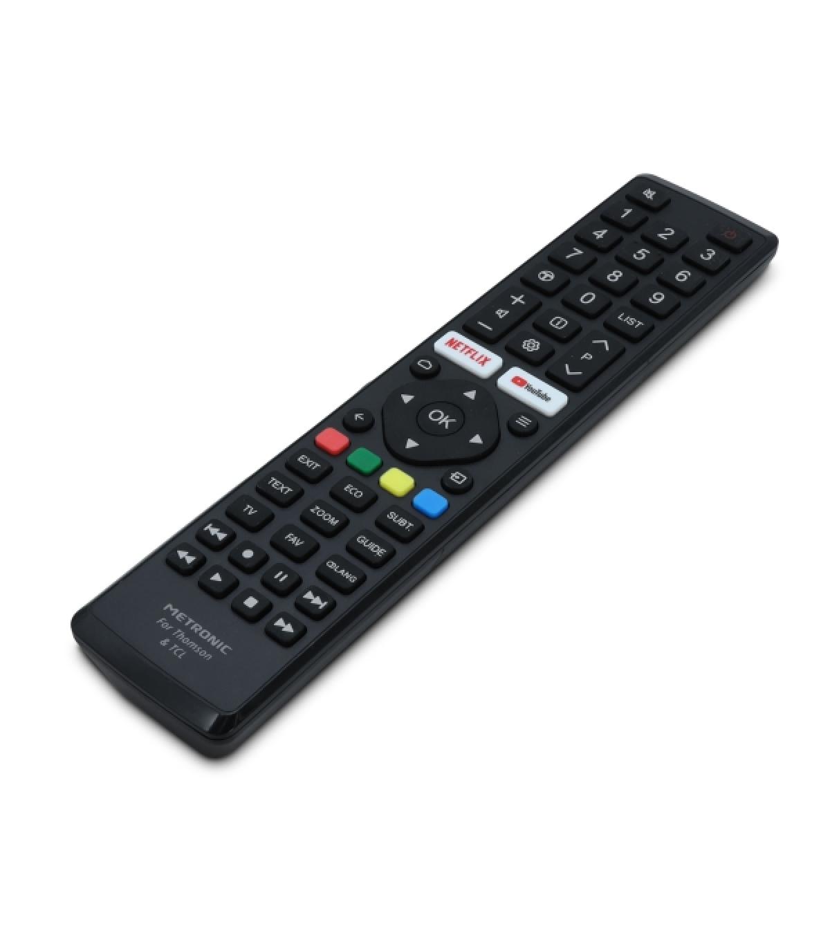 Compatible con todos los televisores Thomson y TCL: sea cual sea el tipo de televisor (LCD, LED, Plasma, etc.). Reemplaza el mando a distancia original Thomson y TCL.Mismo funcionamiento que el mando original: admite todas las funciones habituales de Thomson y TCL.Listo para usar: inserte las pilas y su mando estara preparado para ser utilizado.52 teclas.Teclas Netflix y Youtube para acceso directo rapido..Funciona con 2 pilas AAA (no incluidas).
