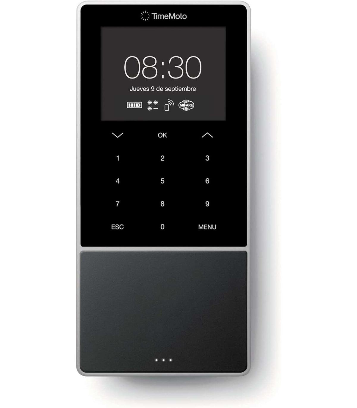 - Permite fichar la entrada o salida con HID, MIFARE, DESfire, una tarjeta RFID o un código PIN.