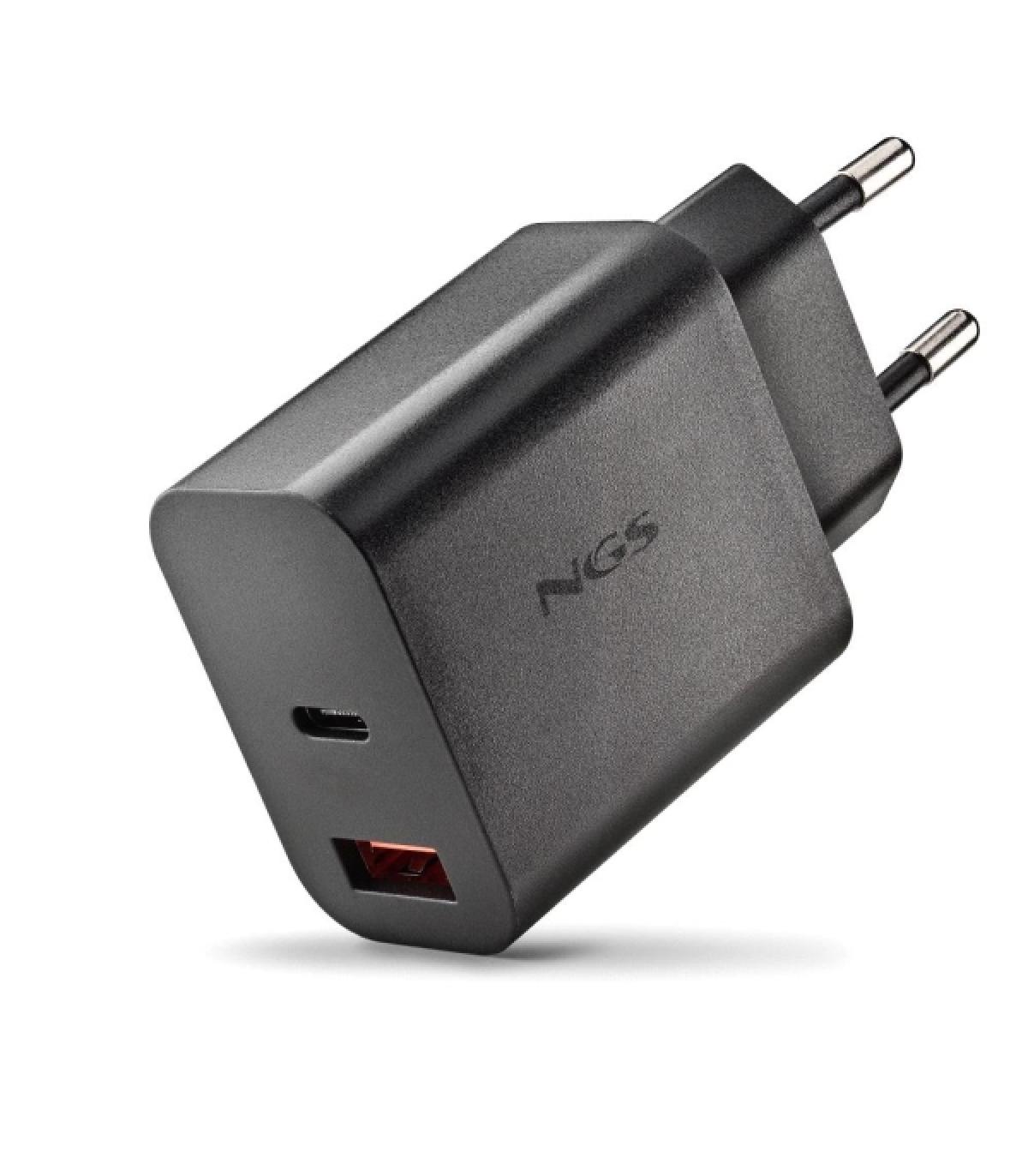 Cargador GaN de pared con una salida USB-C (PD & PPS) y una salida USB-A QC 3.0 (Quick charge) de hasta 30W de potencia máxima para cargar dispositivos de manera rápida.