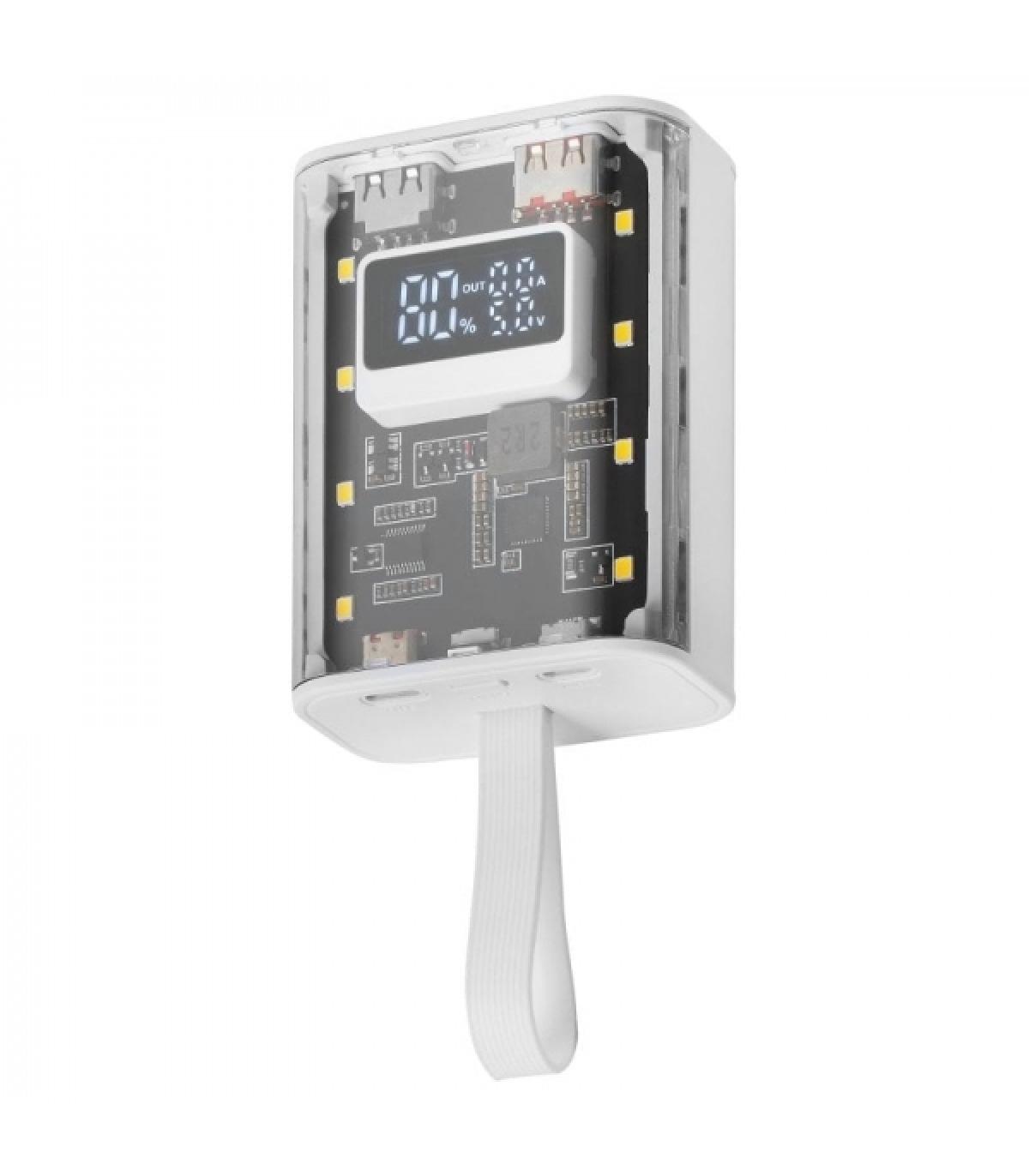 Apoyada en su tecnología avanzada de carga rápida, que ofrece una potencia de salida de hasta 22.5W, esta power bank garantiza una carga ultrarrápida y eficiente. Además, permite la carga simultánea de hasta tres dispositivos, lo que la convierte en una solución versátil y práctica para mantener tus dispositivos siempre listos para usar. Su diseño compacto y ligero, junto con su carcasa transparente, no solo ofrece una estética única, sino también una experiencia de carga excepcional.