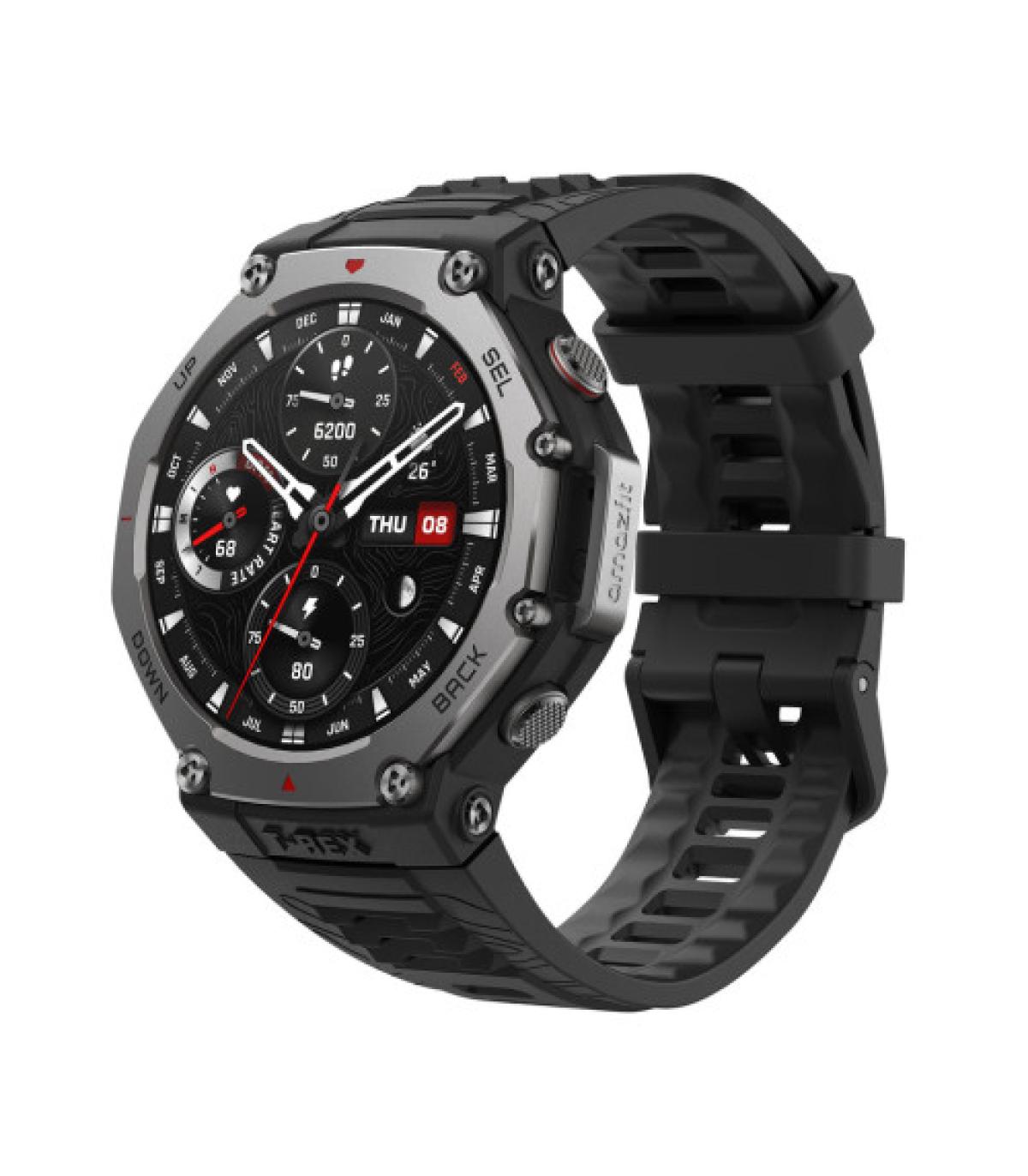 Amazfit T-Rex 3. Diagonal de la pantalla: 3,81 cm (1.5"), Tecnología de visualización: AMOLED, Resolución de la pantalla: 480 x 480 Pixeles, Pantalla táctil. Wifi. GPS (satélite). Capacidad de batería: 700 mAh. Peso: 68,3 g. Humedad: resistente al agua hasta: 100 m, Material de la banda: Silicona, Color de banda: Negro, Tamaño de banda: Talla única. Sistema operativo instalado: Zepp OS