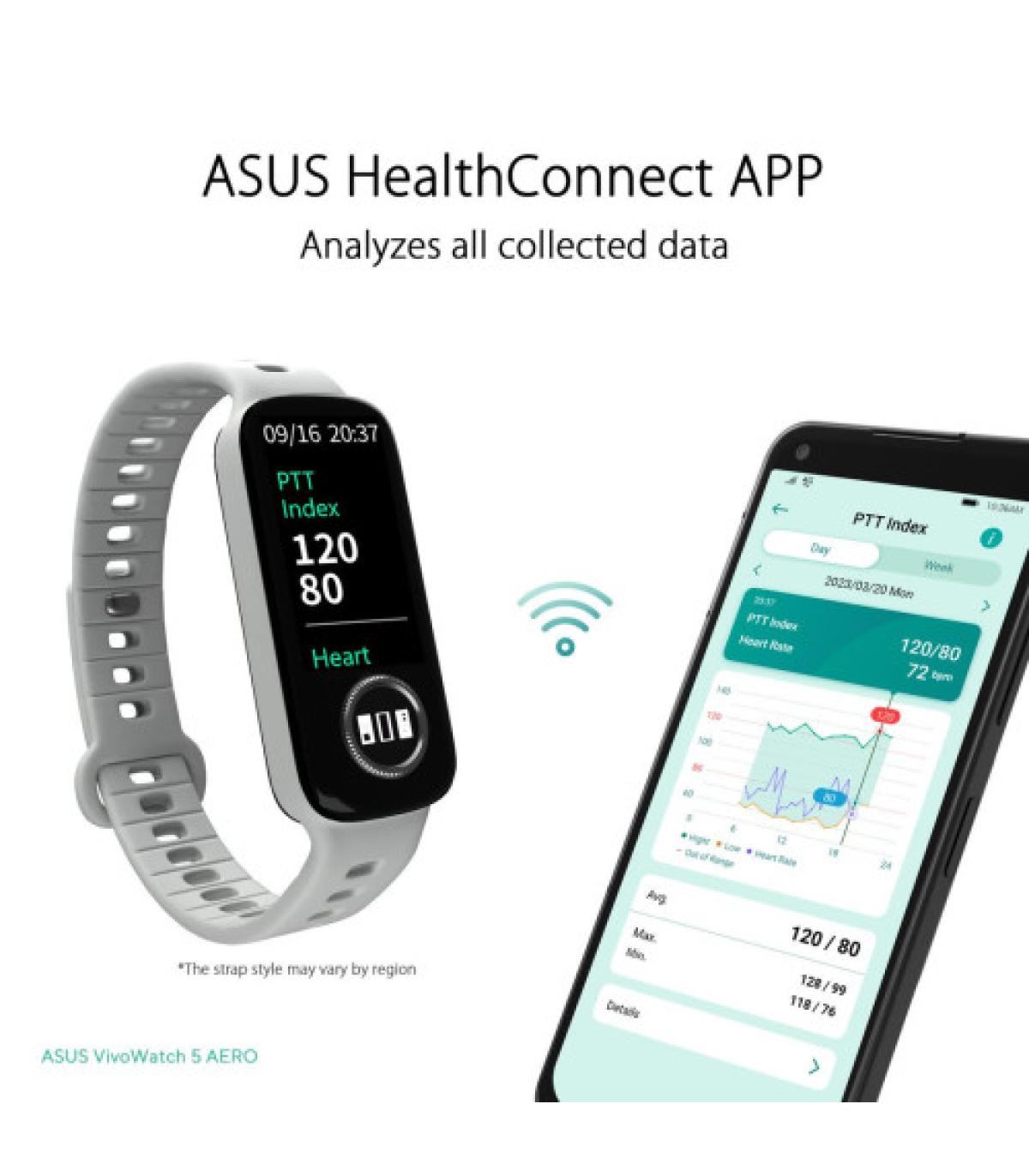 Asus vivowatch 5 aero hc c05 .Tamaño (L)48.9* (W)19.16* (H)13.2mm. Correa caucho silicona. Tamaño de la correa 16 mm.Pantalla de cristal líquido PMOLED 0,96. Conexión BLE. Sensor G (seguimiento de pasos). Sensor GPS (para seguimiento de rutas).Sensor PPG (para frecuencia cardiaca / sueño / calorías quemadas / seguimiento del índice PTT durante todo el día) 1 .Sensor IR1Sensor ECG (para frecuencia cardíaca / índice PTT / nivel de desestresado) 1 .Conectividad Bluetooth 4.2 o posterior (conectar con android 8.0 o posterior / iOS 13.0 o posterior). Resistencia al agua 5 ATM2. Durabilidad Batería de 4 días. Bienestar (1) pasos (2) calorías quemadas (3) calidad del sueño (tiempo de sueño, tiempos de voltereta, frecuencia cardiaca media. índice de sueño confortable, nivel de O2 en pulso).Gestión de la salud (1) Frecuencia cardiaca (2) Nivel de O2 por pulso (3) Índice PTT.Actividad y ejercicio (1) Entrenamiento de ritmo (2) Ejercicio y frecuencia cardiaca de fondo (3) Velocidad de ejercicio,distancia, duración y mapa Correa Correa de silicona de 16 mm. Producto 47,4*18,6*12,7 mm y un peso de 26g (con correa).Manual del usuario, tarjeta de garantía Este dispositivo y las aplicaciones relacionadas no están destinados al diagnóstico de enfermedades u otras afecciones. Resistente al agua hasta 50 metros No es apto para el submarinismo. Evite los cambios bruscos y excesivos de temperaturalos cambios bruscos de temperatura o presión atmosférica y las actividades a gran velocidad.