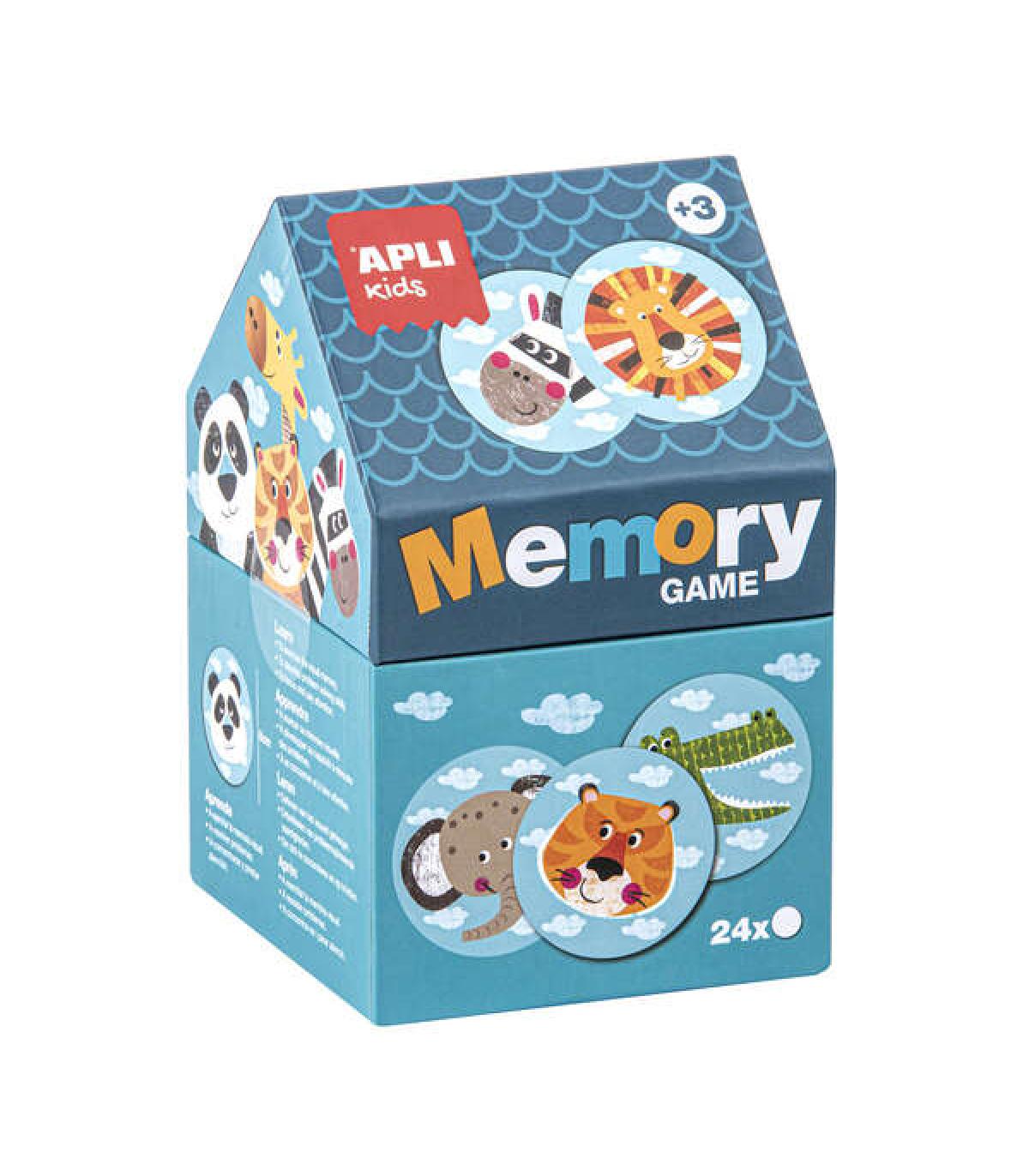 Memory de 24 piezas tamaño Ø 8 cm con un total de 12 parejas de divertidos animales con dibujos infantiles de fácil reconocimiento para los niños. Juego presentado en una caja de cartón en forma de casita.