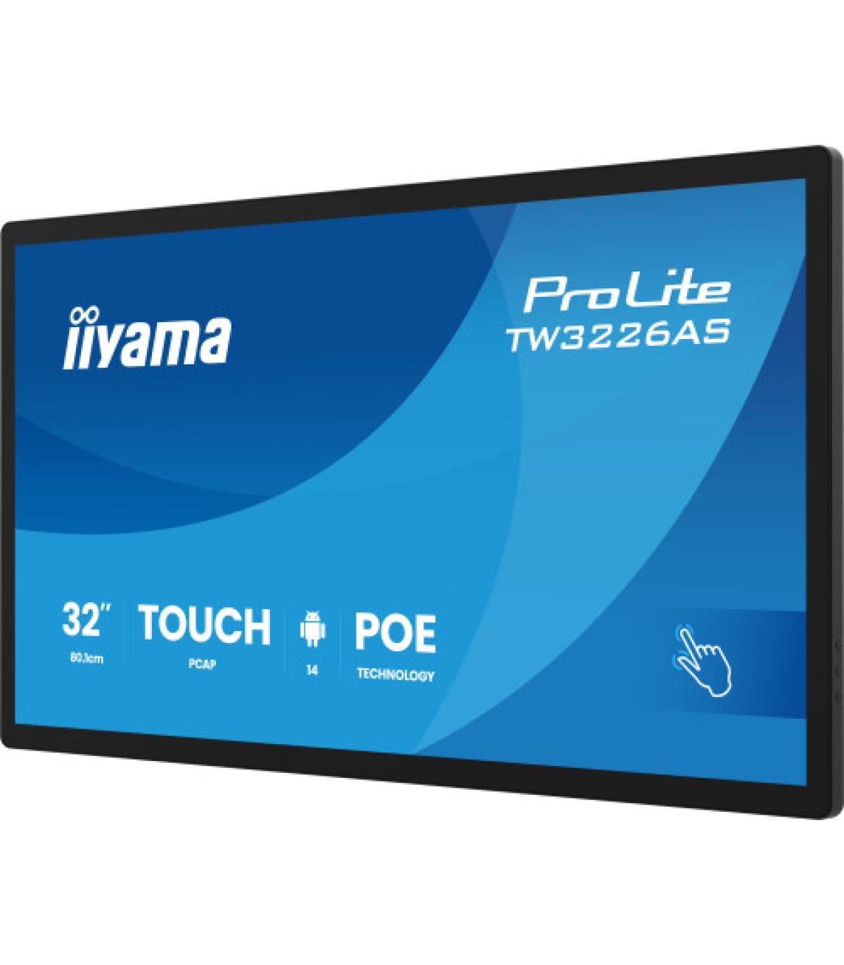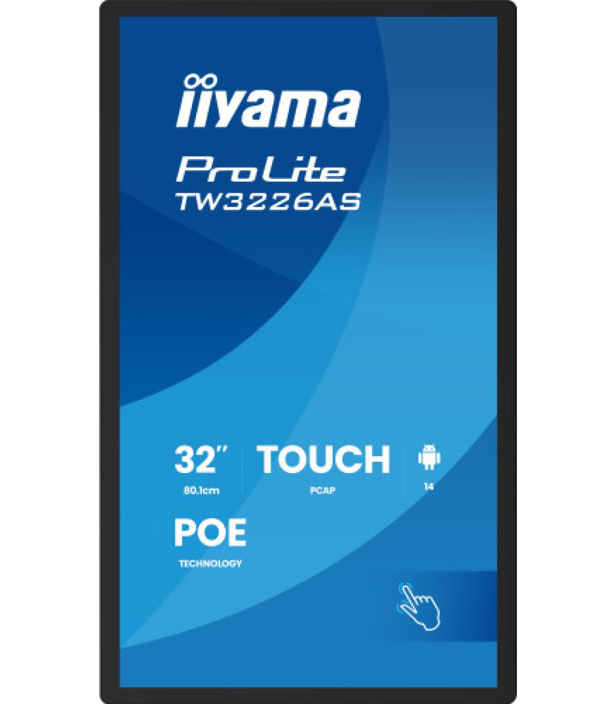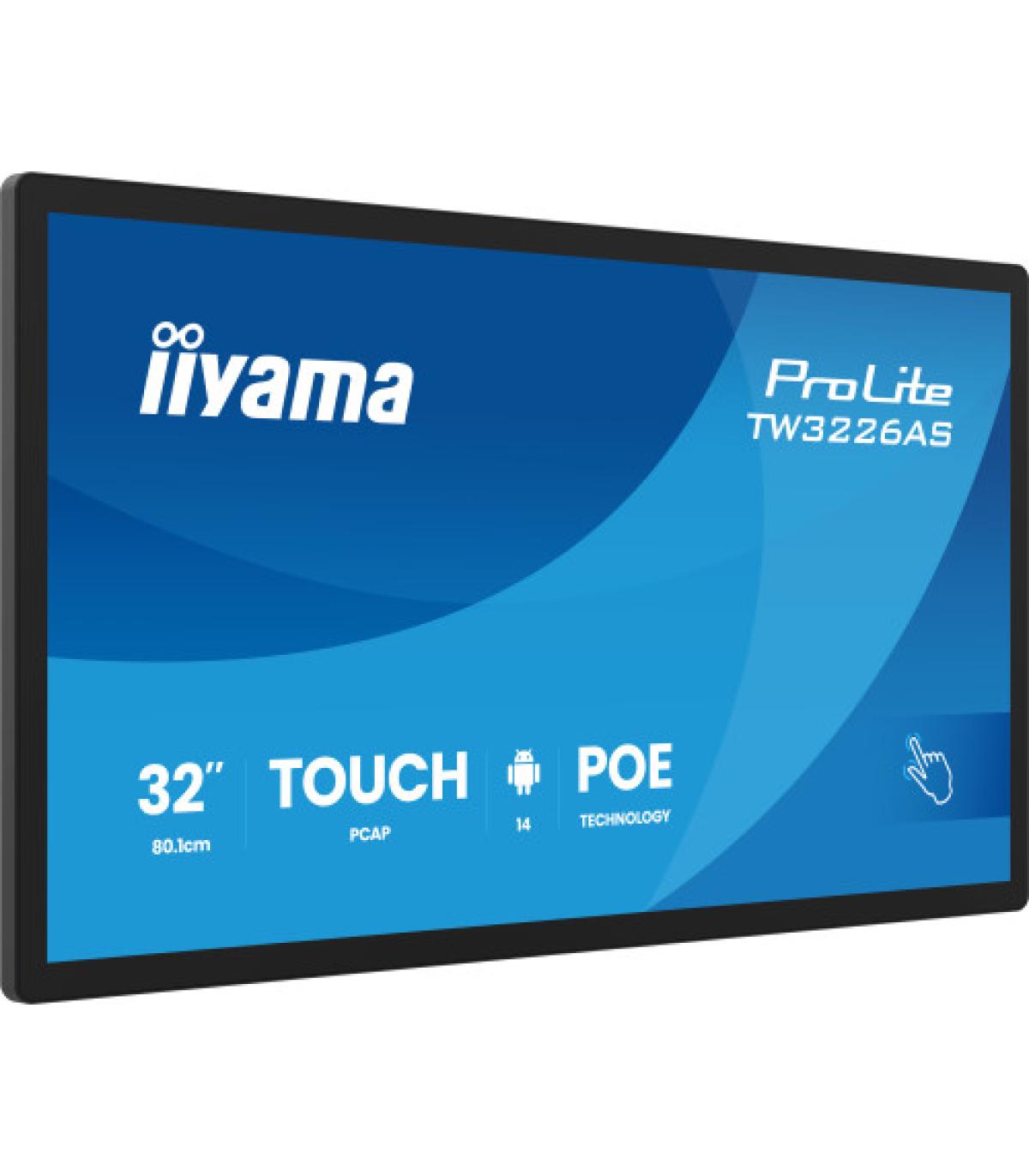 iiyama TW3226AS-B3P. Diseño de producto: Panel plano interactivo. Diagonal de la pantalla: 80 cm (31.5"), Tecnología de visualización: LED, Resolución de la pantalla: 1920 x 1080 Pixeles, Brillo de pantalla: 500 cd / m², Tipo HD: Full HD, Pantalla táctil. Wifi. Horas de funcionamiento (horas/días): 24/7. Sistema operativo instalado: Android 14. Color del producto: Negro