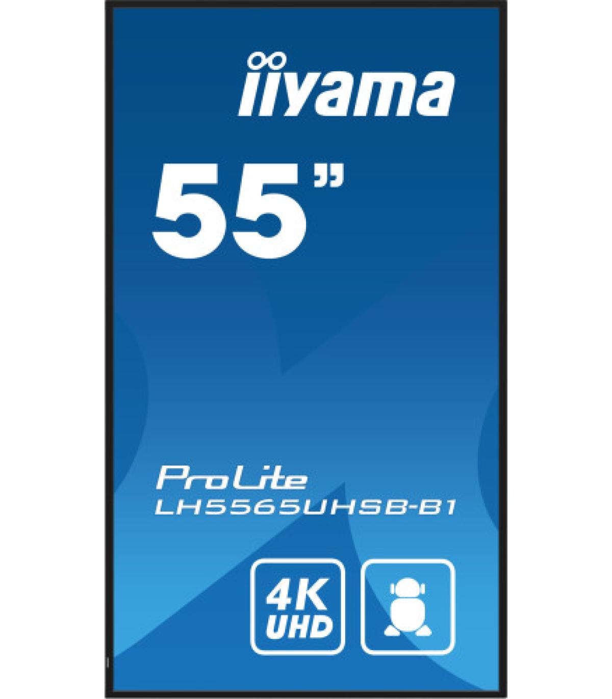 iiyama LH5565UHSB-B1. Diseño de producto: Diseño de quiosco. Diagonal de la pantalla: 138,7 cm (54.6"), Tecnología de visualización: LED, Resolución de la pantalla: 3840 x 2160 Pixeles, Brillo de pantalla: 800 cd / m², Tipo HD: 4K Ultra HD. Wifi. Horas de funcionamiento (horas/días): 24/7. Sistema operativo instalado: Android 11. Color del producto: Negro