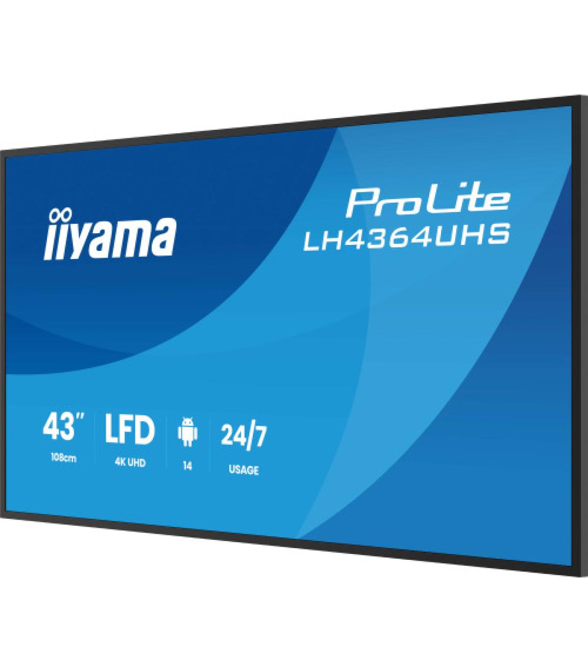 iiyama LH4364UHS-B1AG. Diseño de producto: Pantalla plana para señalización digital. Diagonal de la pantalla: 109,2 cm (43"), Tecnología de visualización: LED, Resolución de la pantalla: 3840 x 2160 Pixeles, Brillo de pantalla: 500 cd / m², Tipo HD: 4K Ultra HD. Wifi. Horas de funcionamiento (horas/días): 24/7. Sistema operativo instalado: Android. Color del producto: Negro