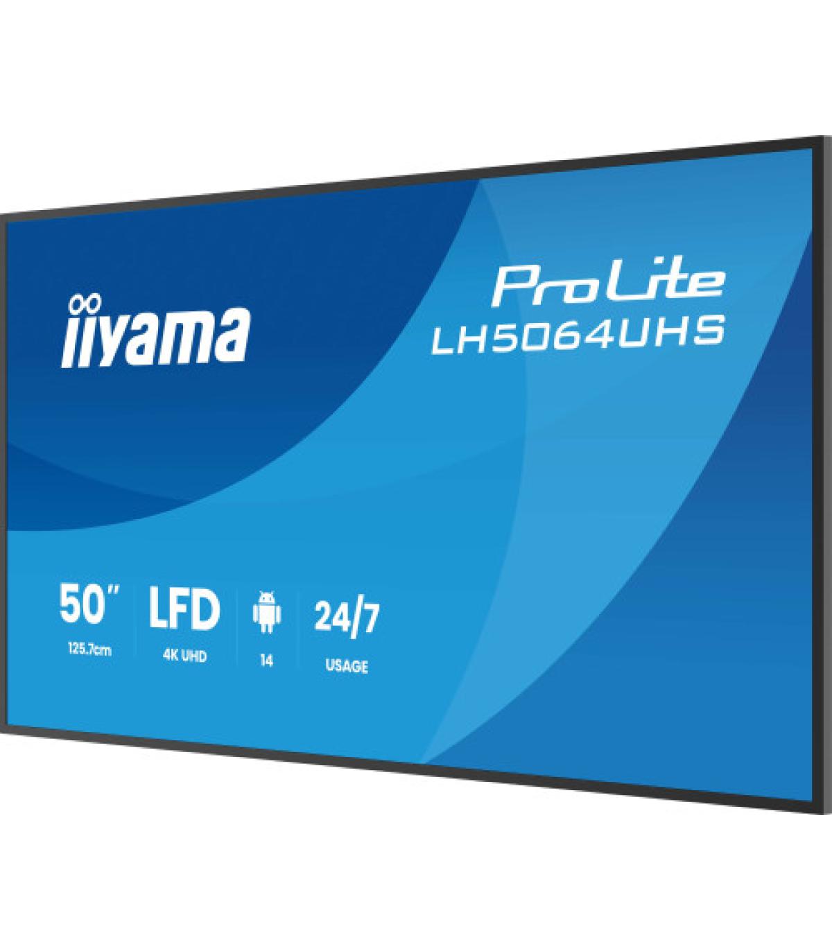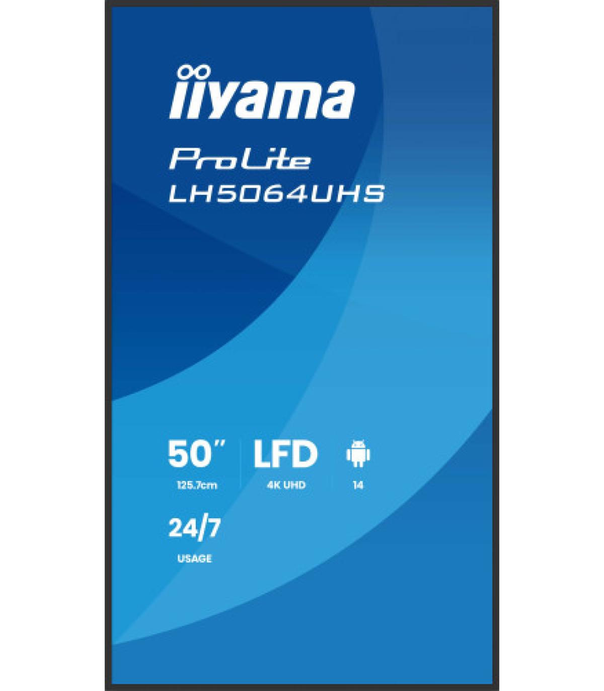 iiyama LH5064UHS-B1AG. Diseño de producto: Pantalla plana para señalización digital. Diagonal de la pantalla: 127 cm (50"), Resolución de la pantalla: 3840 x 2160 Pixeles, Brillo de pantalla: 500 cd / m², Tipo HD: 4K Ultra HD. Wifi. Horas de funcionamiento (horas/días): 24/7. Sistema operativo instalado: Android. Color del producto: Negro