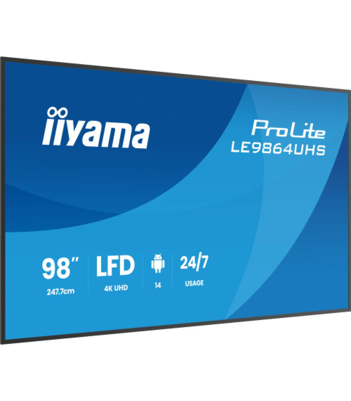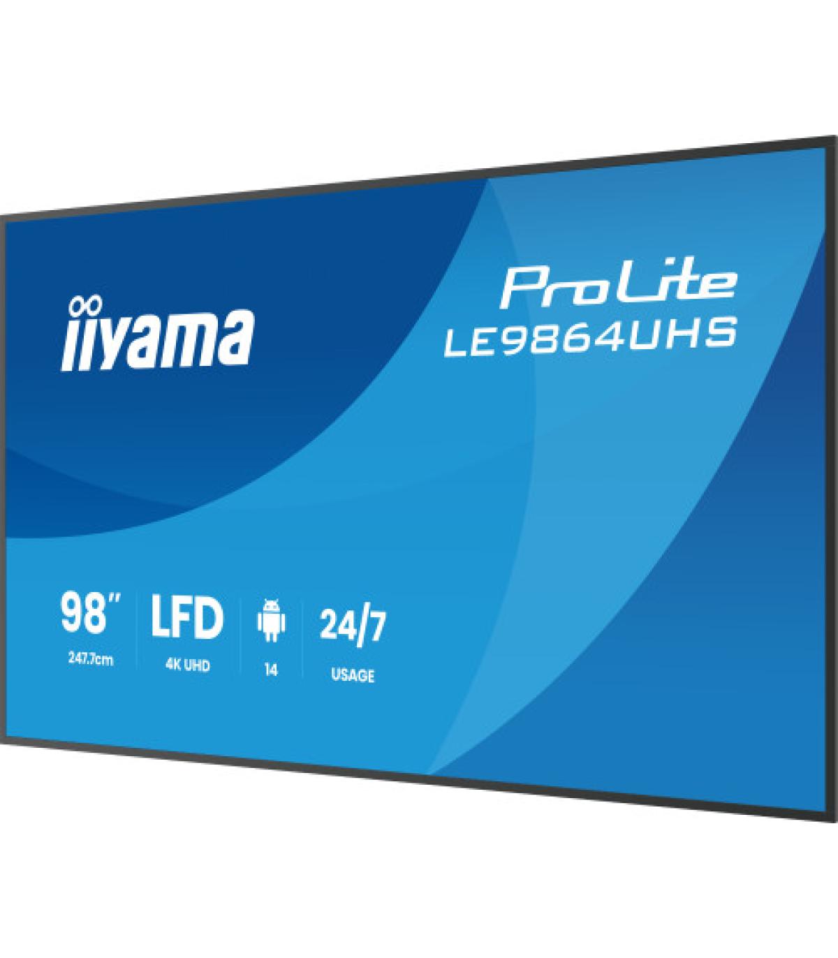 iiyama LE9864UHS-B1AG. Diseño de producto: Pantalla plana para señalización digital. Diagonal de la pantalla: 2,49 m (98"), Resolución de la pantalla: 3840 x 2160 Pixeles, Brillo de pantalla: 500 cd / m², Tipo HD: 4K Ultra HD. Wifi. Horas de funcionamiento (horas/días): 24/7. Sistema operativo instalado: Android. Color del producto: Negro