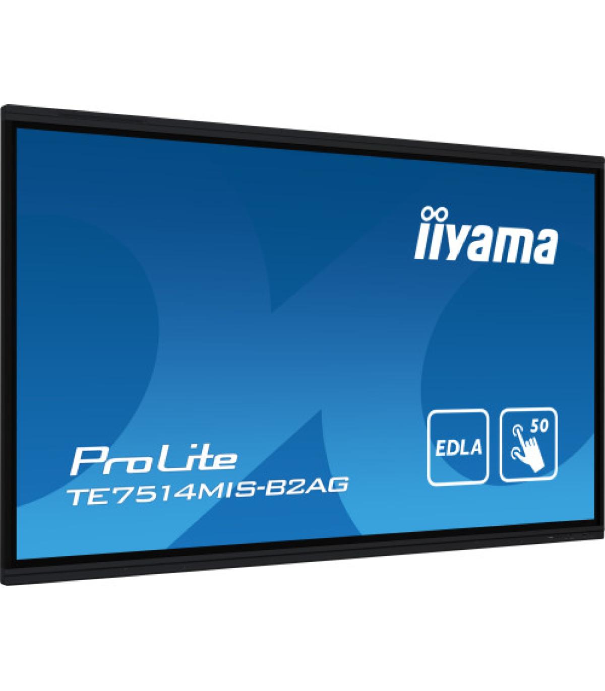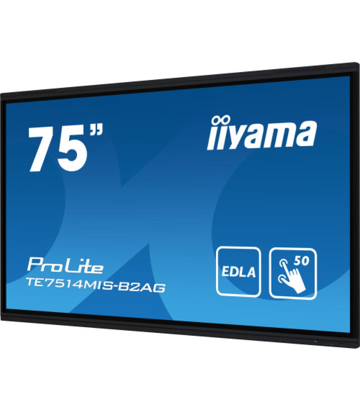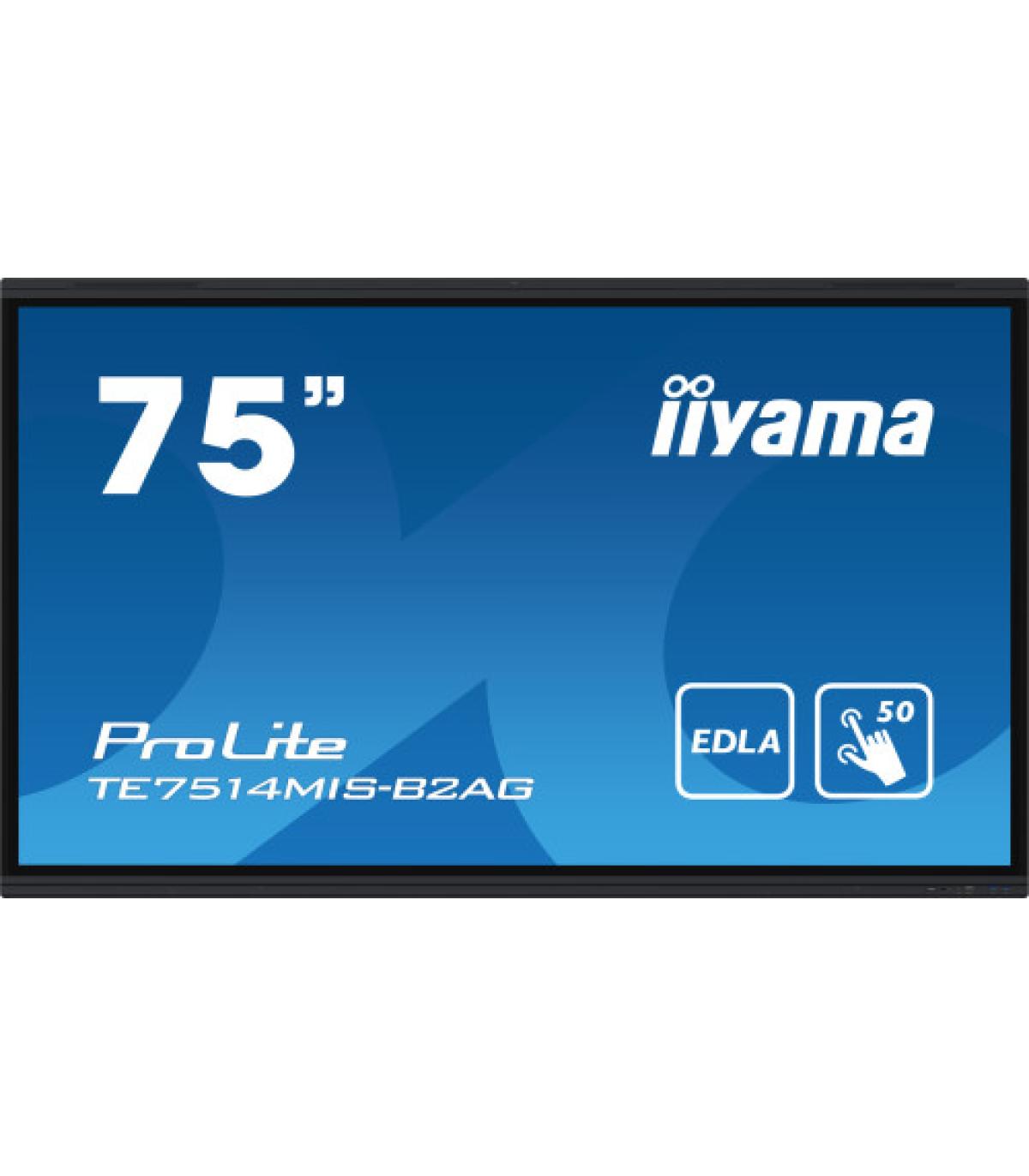 iiyama PROLITE TE7514MIS-B2AG. Diseño de producto: Pantalla plana para señalización digital. Diagonal de la pantalla: 190,5 cm (75"), Tecnología de visualización: LCD, Resolución de la pantalla: 3840 x 2160 Pixeles, Brillo de pantalla: 435 cd / m², Tipo HD: 4K Ultra HD, Pantalla táctil. Wifi. Horas de funcionamiento (horas/días): 24/7. Sistema operativo instalado: Android. Color del producto: Negro