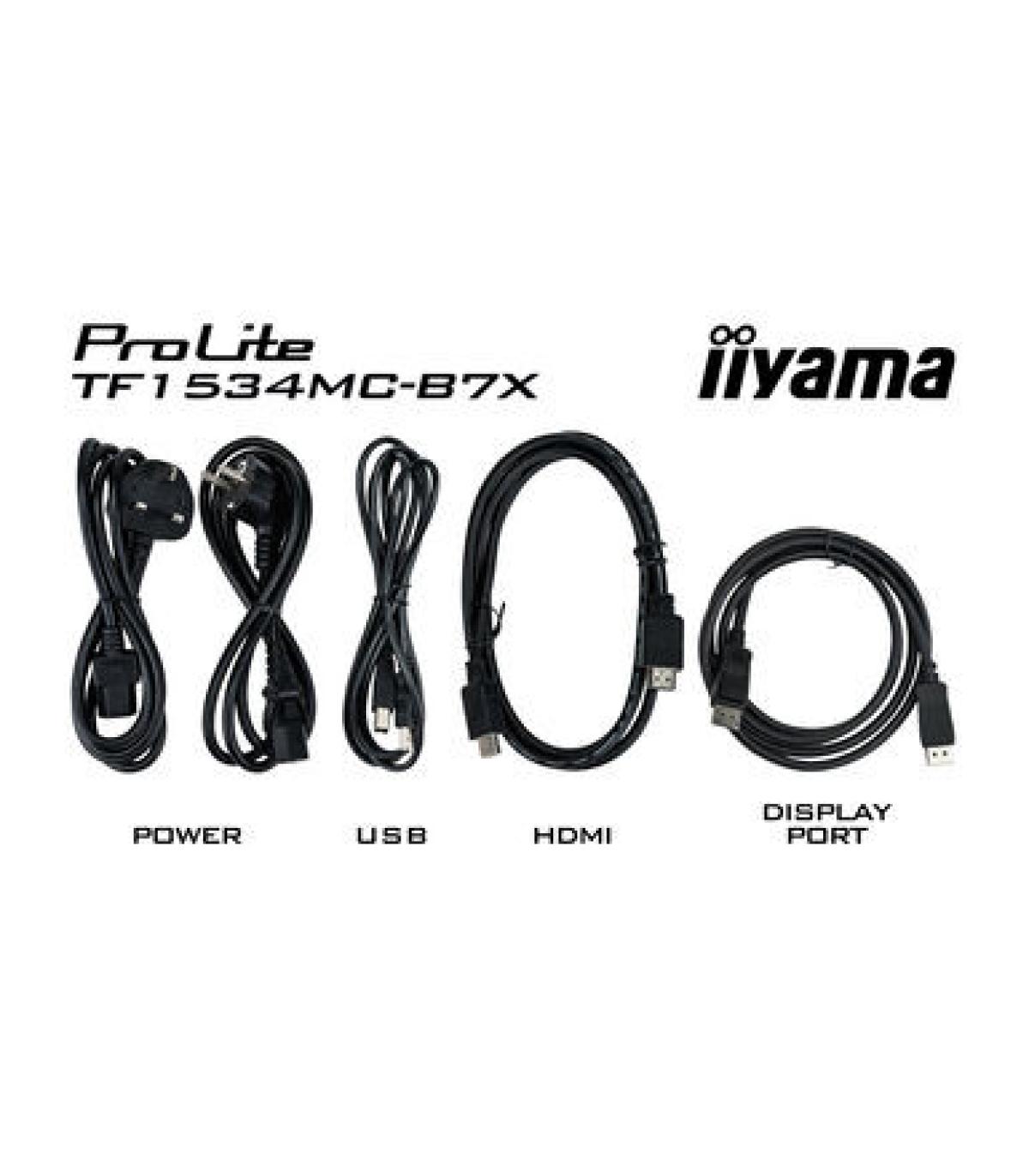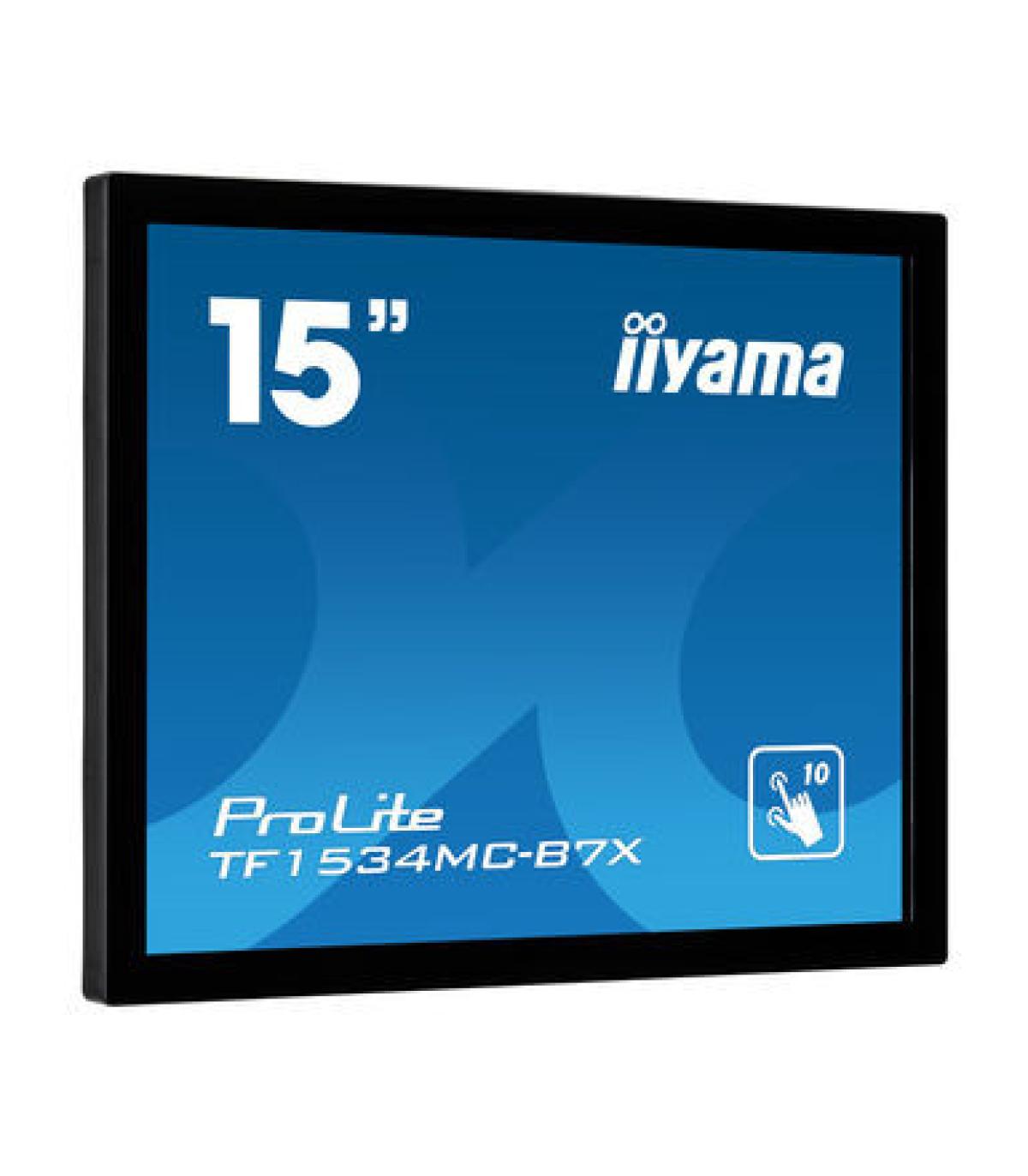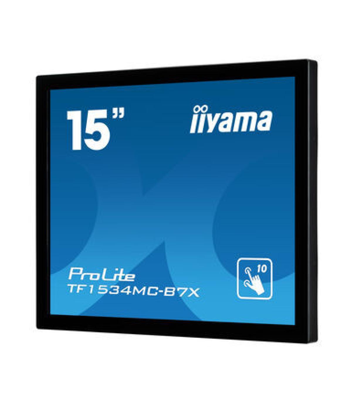 iiyama ProLite TF1534MC-B7X. Diagonal de la pantalla: 38,1 cm (15"), Brillo de pantalla: 370 cd / m², Tipo HD: XGA. Color del producto: Negro, Dureza de la superficie: 7H, Código IP (International Protection): IP65. Tecnología táctil: Multi-touch, Tecnología touchscreen: Sistema capacitivo proyectado, Tipo de pantalla táctil: Multi-usuario. Interfaz de panel de montaje: 100 x 100 mm. Clase de eficiencia energética (SDR): E, Consumo de energía (SDR) por 1000 horas: 10 kWh, Tipo de fuente de alimentación: CC