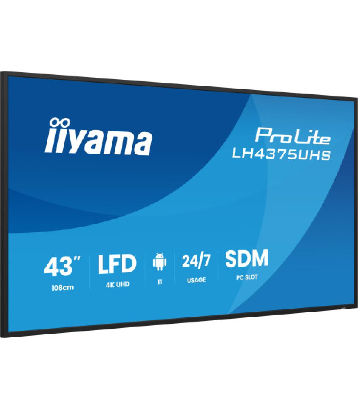 iiyama LH4375UHS-B2AG. Diseño de producto: Pantalla plana para señalización digital. Diagonal de la pantalla: 108 cm (42.5"), Tecnología de visualización: LCD, Resolución de la pantalla: 3840 x 2160 Pixeles, Brillo de pantalla: 500 cd / m², Tipo HD: 4K Ultra HD. Wifi. Horas de funcionamiento (horas/días): 24/7. Sistema operativo instalado: Android 11. Color del producto: Negro