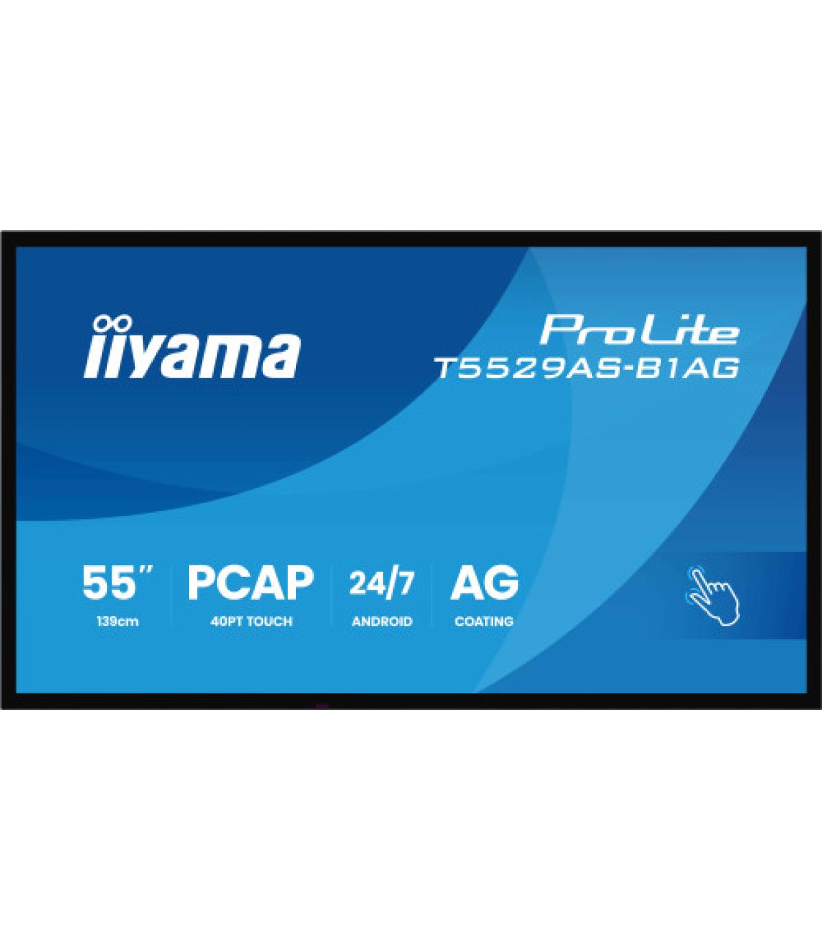 iiyama T4329AS-B1AG. Diseño de producto: Panel plano interactivo. Diagonal de la pantalla: 138,7 cm (54.6"), Tecnología de visualización: LED, Resolución de la pantalla: 3840 x 2160 Pixeles, Brillo de pantalla: 500 cd / m², Tipo HD: 4K Ultra HD, Pantalla táctil. Wifi. Horas de funcionamiento (horas/días): 24/7. Sistema operativo instalado: Android. Color del producto: Negro