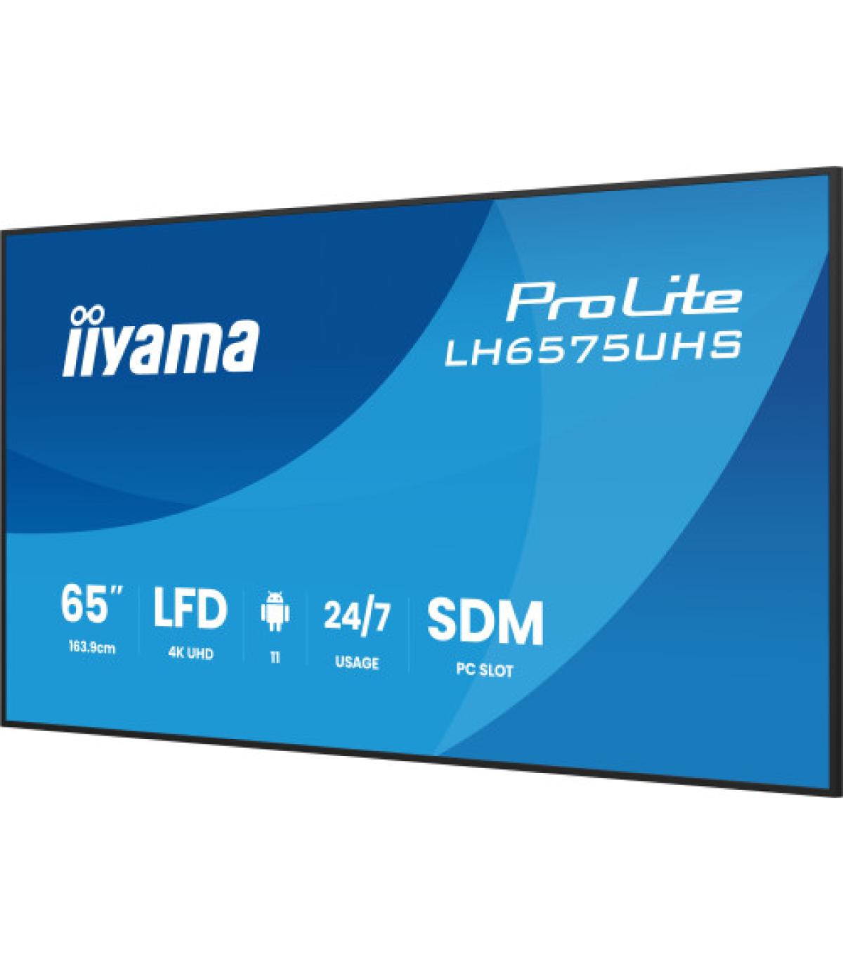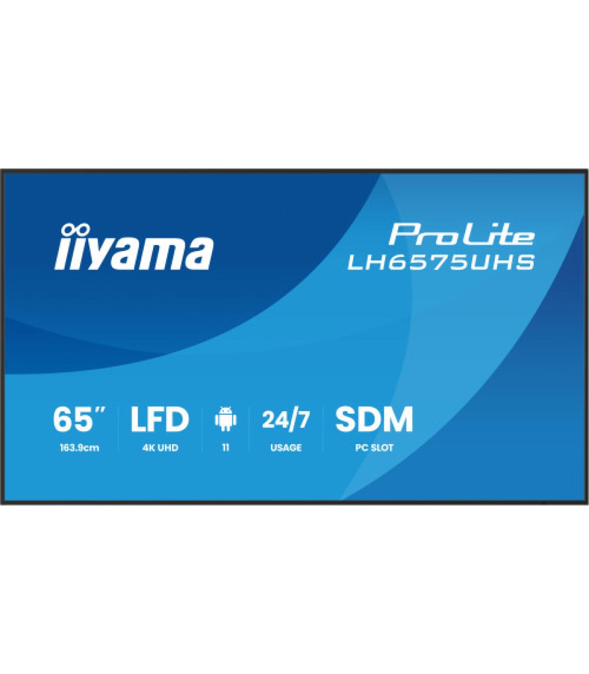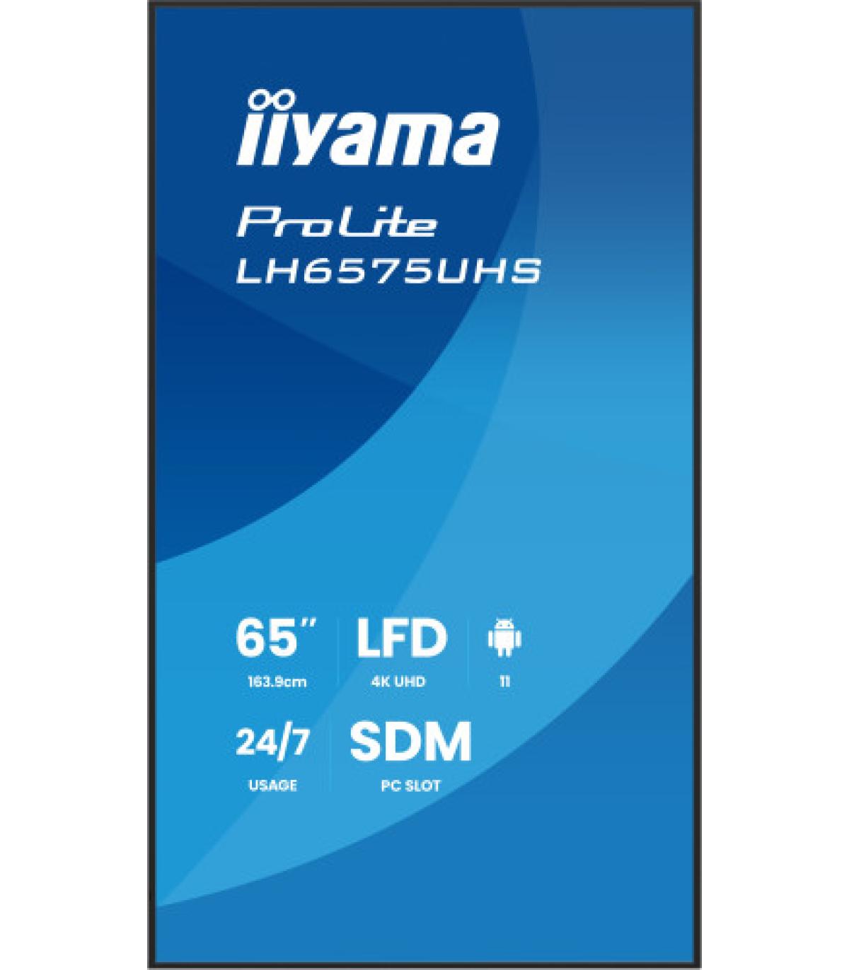iiyama LH6575UHS-B2AG. Diseño de producto: Pantalla plana para señalización digital. Diagonal de la pantalla: 163,8 cm (64.5"), Tecnología de visualización: LCD, Resolución de la pantalla: 3840 x 2160 Pixeles, Brillo de pantalla: 500 cd / m², Tipo HD: 4K Ultra HD. Wifi. Horas de funcionamiento (horas/días): 24/7. Sistema operativo instalado: Android 11. Color del producto: Negro