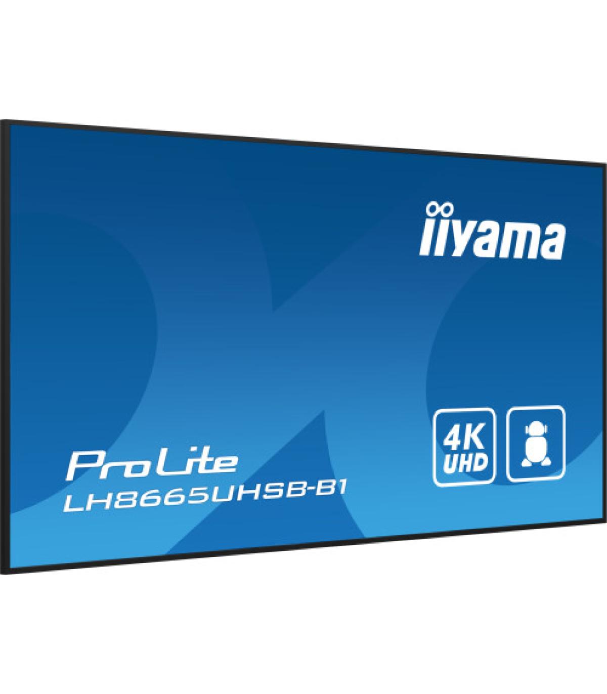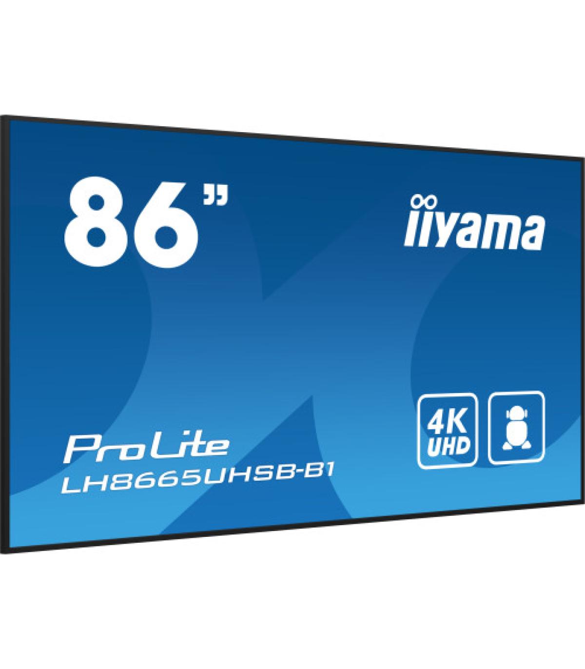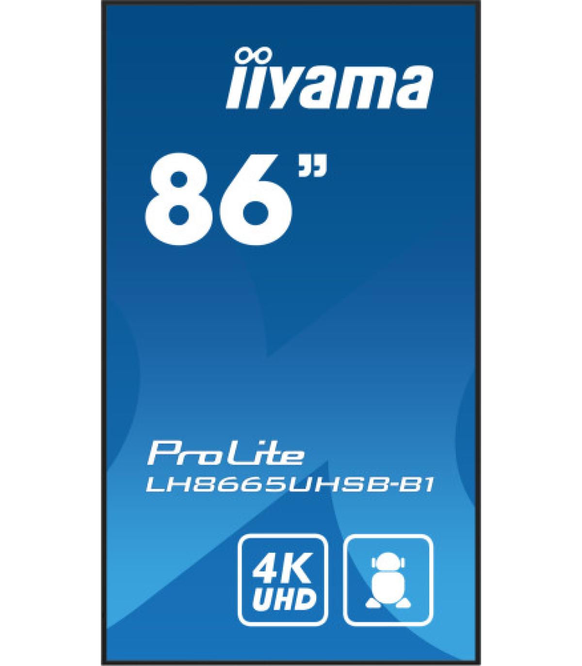 iiyama LH8665UHSB-B1. Diseño de producto: Diseño de quiosco. Diagonal de la pantalla: 2,18 m (86"), Tecnología de visualización: LED, Resolución de la pantalla: 3840 x 2160 Pixeles, Brillo de pantalla: 800 cd / m², Tipo HD: 4K Ultra HD. Wifi. Horas de funcionamiento (horas/días): 24/7. Sistema operativo instalado: Android 11. Color del producto: Negro