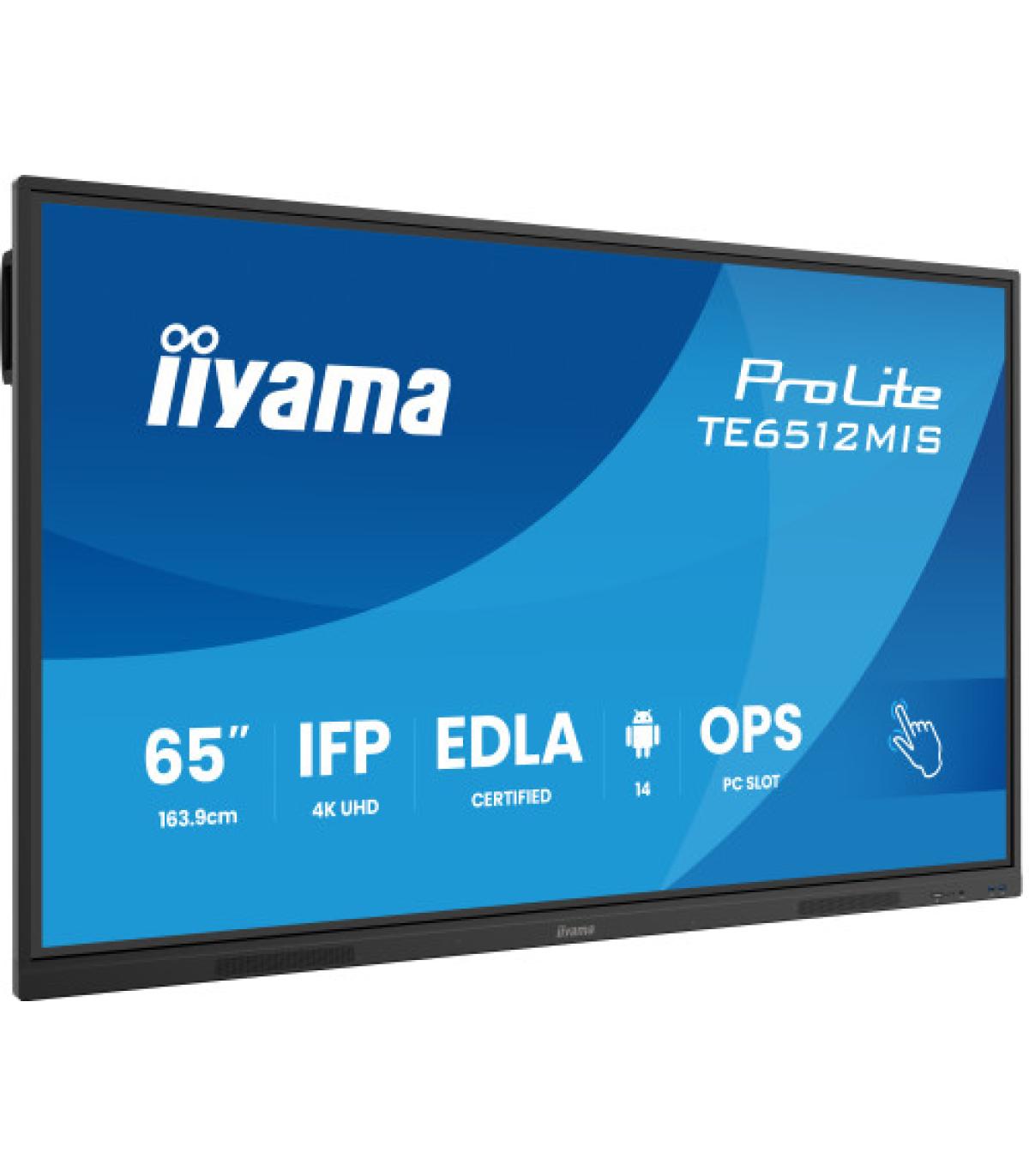 iiyama TE6512MIS-B4AG. Diseño de producto: Panel plano interactivo. Diagonal de la pantalla: 165,1 cm (65"), Tecnología de visualización: LCD, Resolución de la pantalla: 3840 x 2160 Pixeles, Brillo de pantalla: 400 cd / m², Tipo HD: 4K Ultra HD, Pantalla táctil. Wifi. Horas de funcionamiento (horas/días): 24/7. Sistema operativo instalado: Android 11. Color del producto: Negro