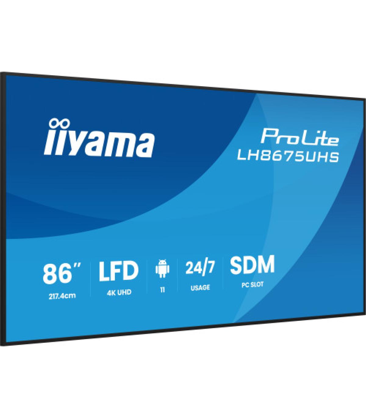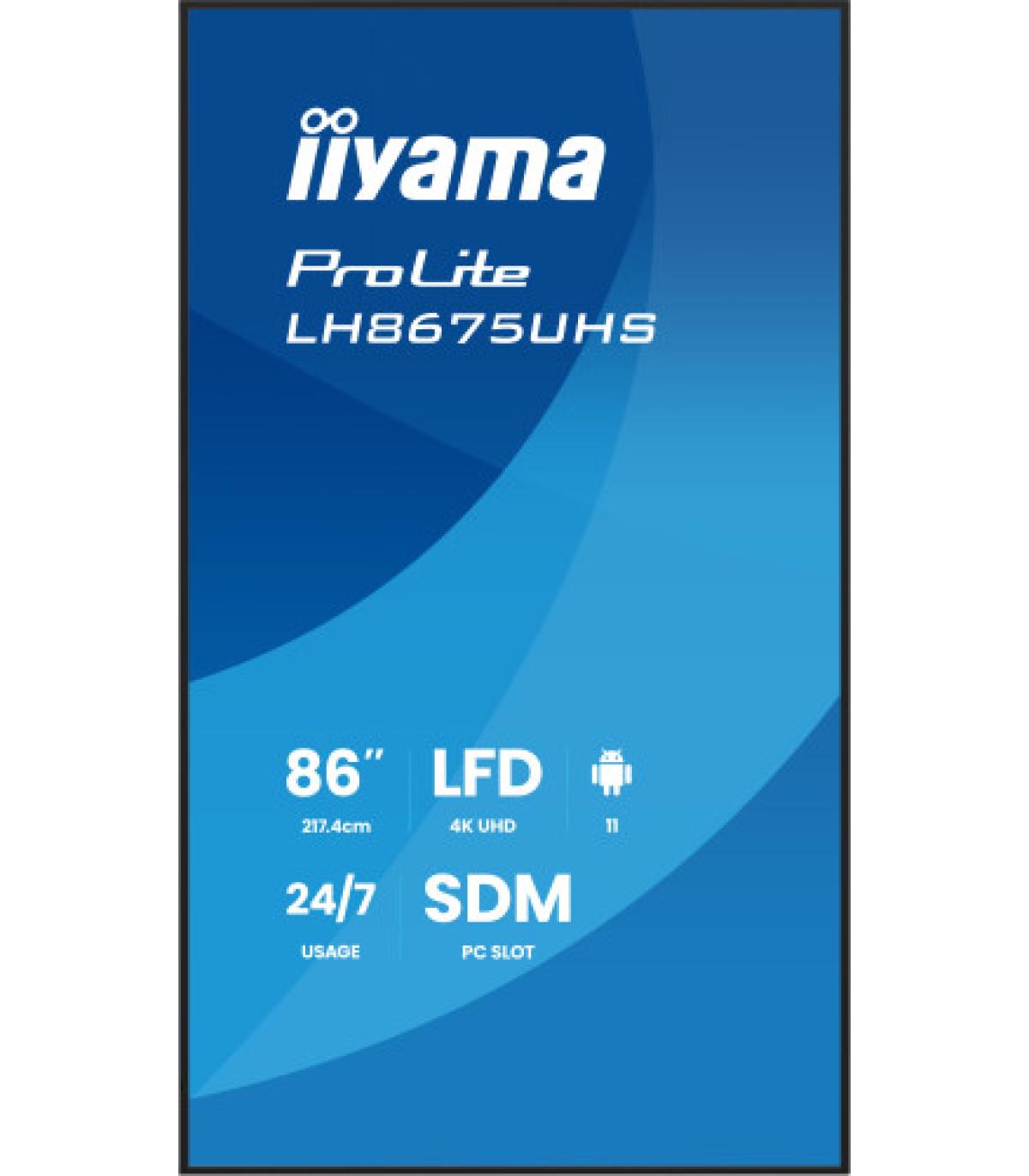 iiyama LH8675UHS-B2AG. Diseño de producto: Pantalla plana para señalización digital. Diagonal de la pantalla: 2,17 m (85.6"), Tecnología de visualización: LCD, Resolución de la pantalla: 3840 x 2160 Pixeles, Brillo de pantalla: 500 cd / m², Tipo HD: 4K Ultra HD. Wifi. Horas de funcionamiento (horas/días): 24/7. Sistema operativo instalado: Android 11. Color del producto: Negro