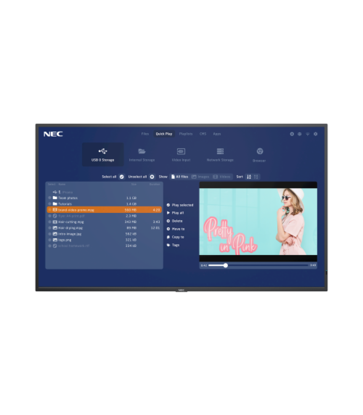 NEC MultiSync MA431-MPi4. Diagonal de la pantalla: 109,2 cm (43"), Tecnología de visualización: LCD, Resolución de la pantalla: 3840 x 2160 Pixeles, Brillo de pantalla: 500 cd / m², Tipo HD: 4K Ultra HD. Horas de funcionamiento (horas/días): 24/7. Color del producto: Negro